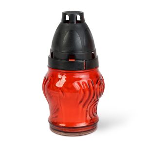 Üveg mécses műanyag kupakkal, üveg szín: piros, kupak szín: fekete – 14 cm TW1013