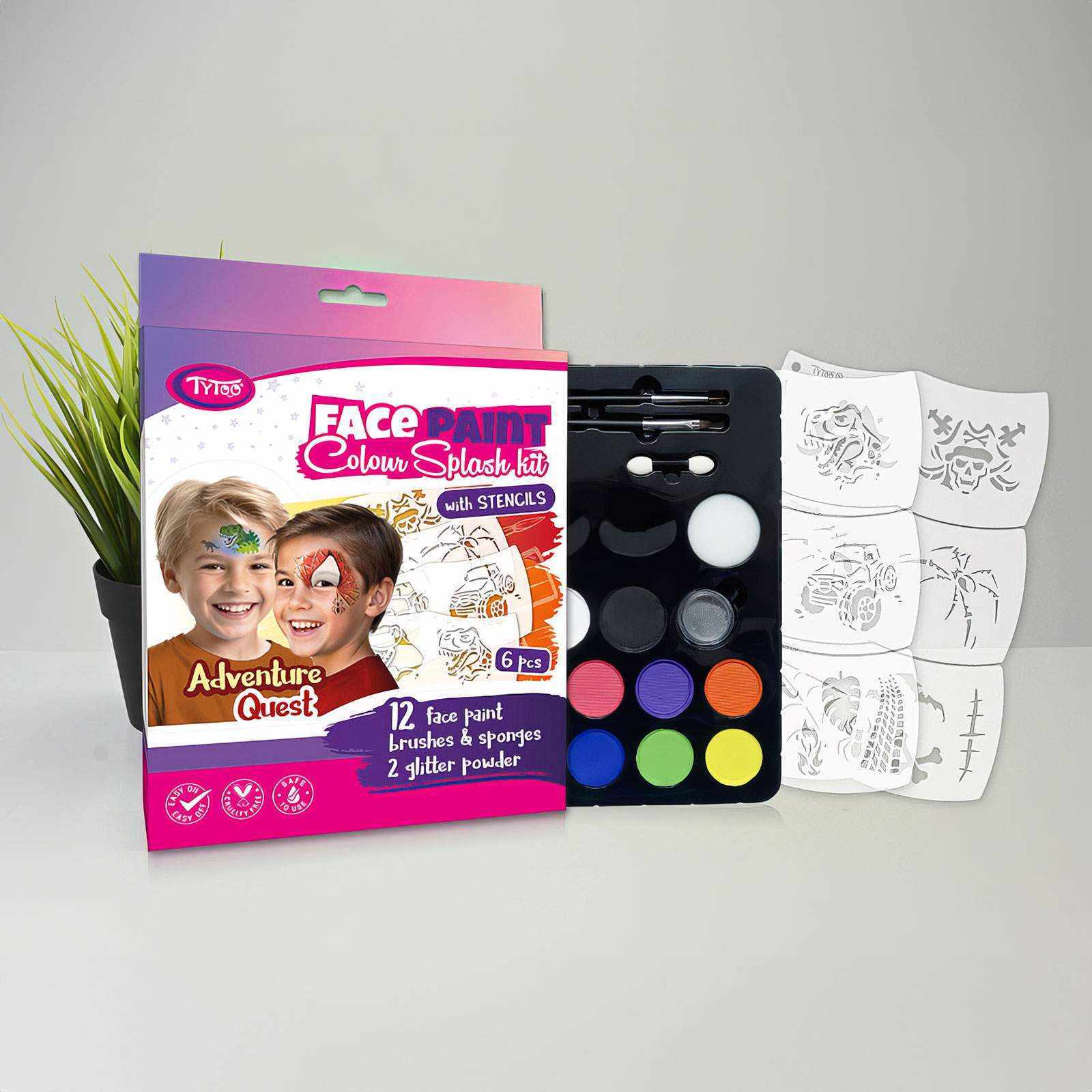 Hatalmas öröm a gyerekeknek egy arcfestés, amit most már rajztudás nélkül Ön is elkészíthet otthon. A TyToo Adventure Quest arcfestő szettje a 12 féle szín mellett 6 db Mosaic sablont is tartalmaz. A sablon használata egyszerű és szórakoztató, a paletta pedig rengeteg színt tartalmaz, hogy igényeire formálhassa a mintákat.
