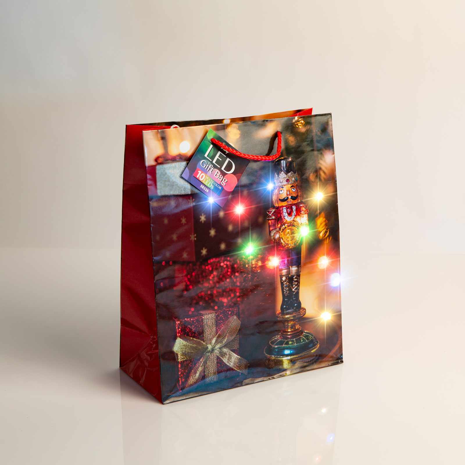 Az ajándéktasak oldalát különleges minta díszíti és kiváló minőségű papírból készült, hogy hosszútávon is tökéletesen szolgáljon. A tasakon elhelyezett LED-ek különleges hangulatot teremtenek, melyek energiájáról a beépített elemek gondoskodnak.