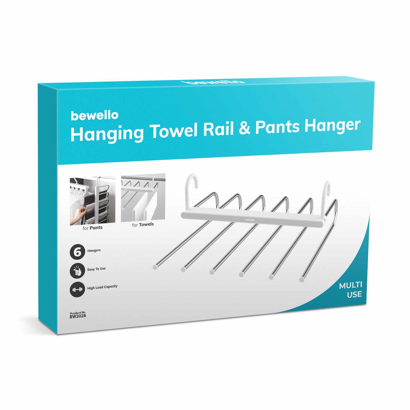Praktikus, kompakt méretű eszköz, amely segít megoldani és helytakarékosan szárítani törölközőit vagy éppen a szekrényben tárolni nadrágjai. Az akasztók segítségével bármelyik szekrényben rögzíthető, alkalmas 6 db nadrág egyidejű tárolására.