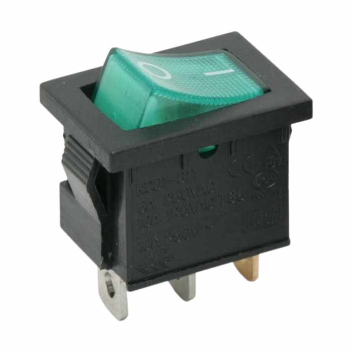 Beépíthető billenőkapcsoló zöld színben, mely kiválóan használható gépekben, elektromos berenedezésekben. Felkapcsolt állapotban zöld világítással rendelkezik, így távolról is ellenőrizhető a bekapcsolt állapot. Műanyag házzal és 3 db 4,8 mm-es csatlakozólábbal rendelkezik.