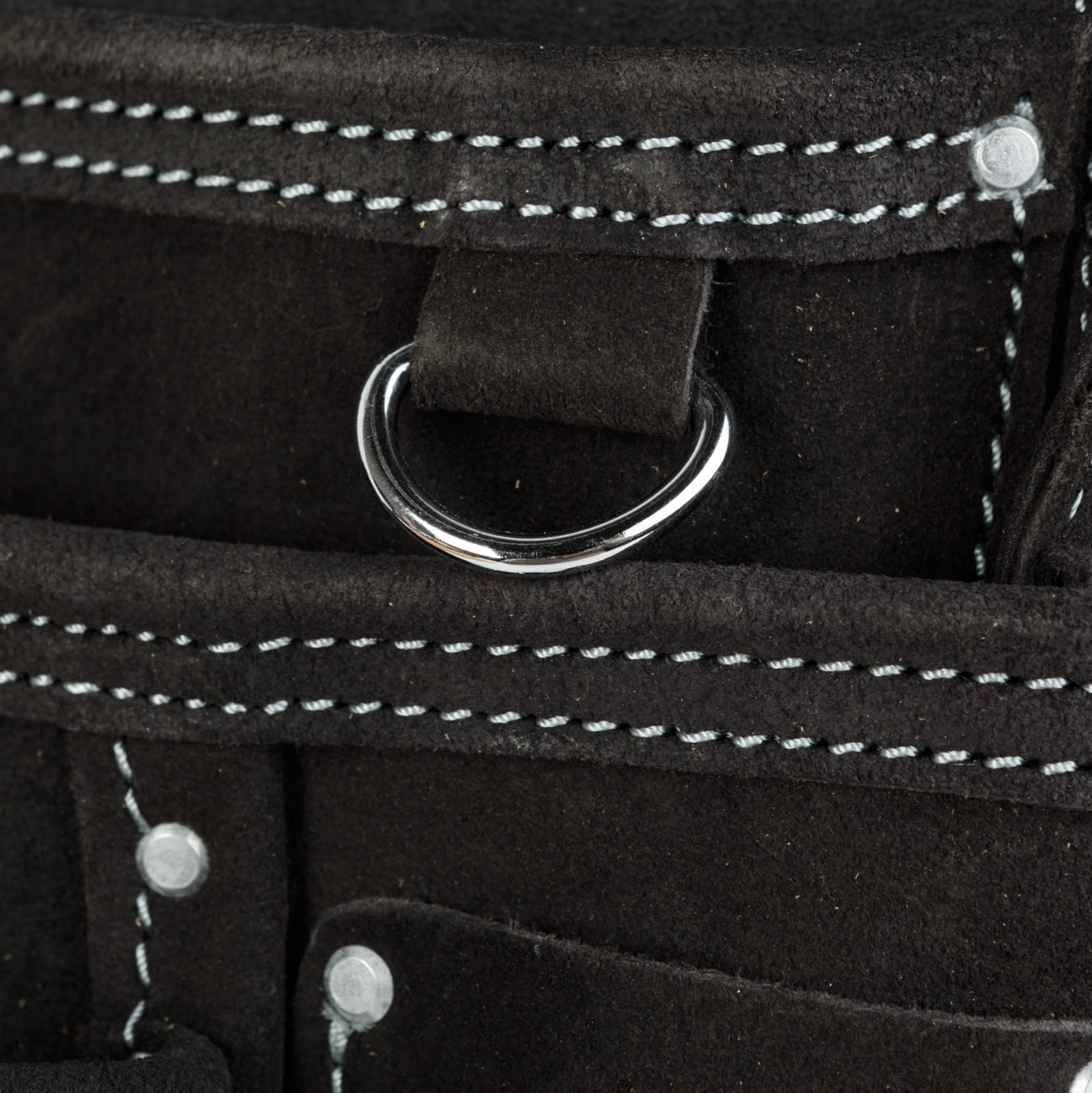 Hasított bőrből készült övtáska 2 nagy zsebbel, 2 akasztóhurokkal, övvel és 4 kisebb tárolóval (pl. ceruzának). Strapabíró kivitel, fém szegecsekkel erősítve.