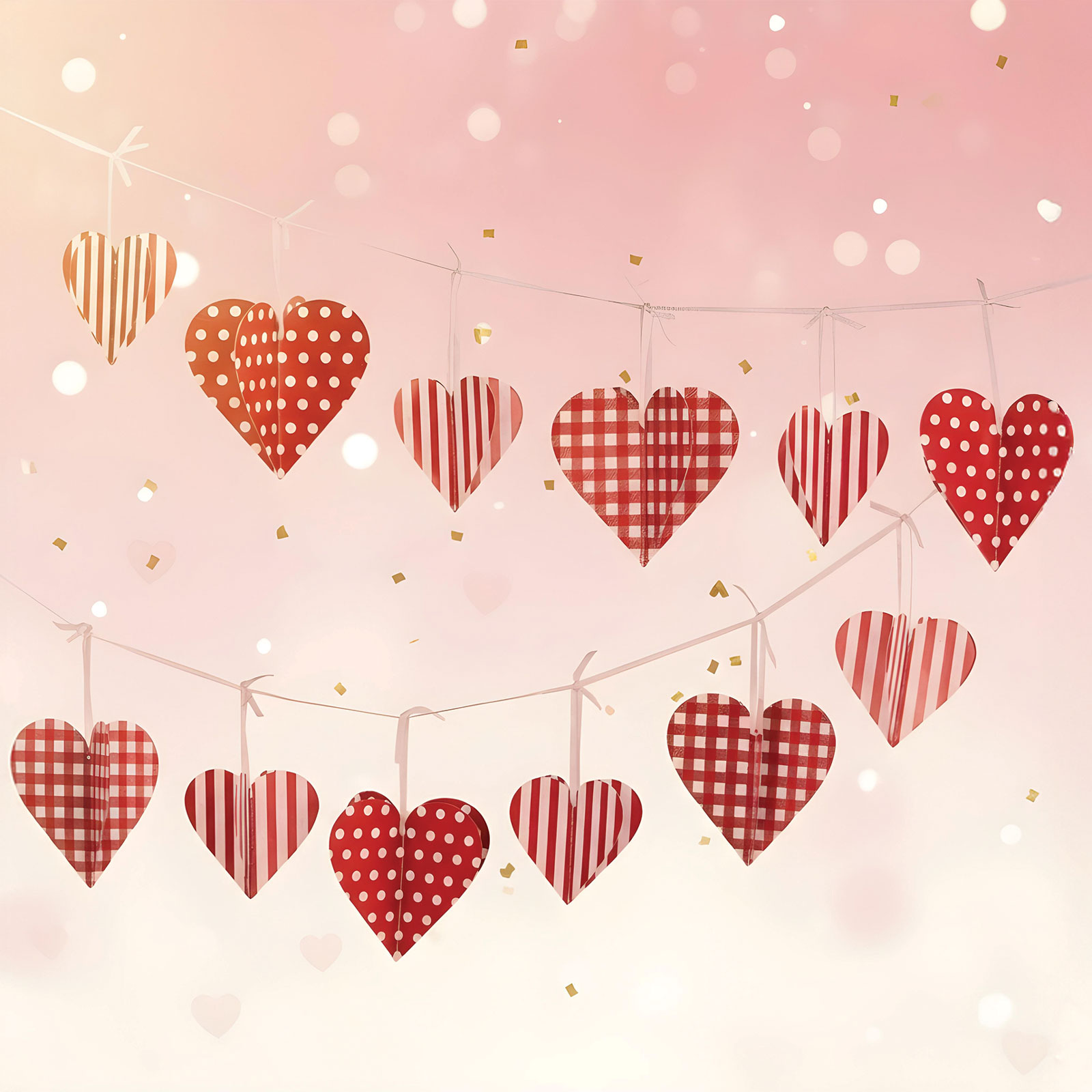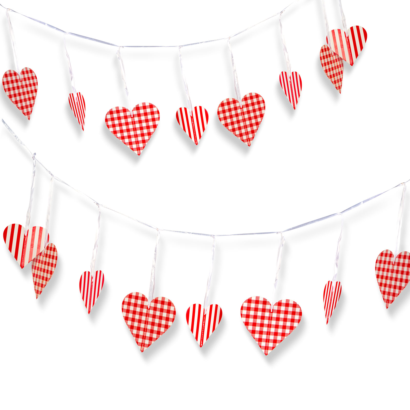 Dobja fel otthonát vagy rendezvényét ezzel a romantikus szív alakú girlanddal! A 2 méter hosszú papírdísz 12 darab piros-fehér kockás és csíkos mintájú szívből áll, amelyek vidám és szeretetteljes hangulatot varázsolnak bármilyen alkalomra. Ideális választás Valentin-napra, születésnapra, évfordulóra vagy akár esküvői dekorációként is.