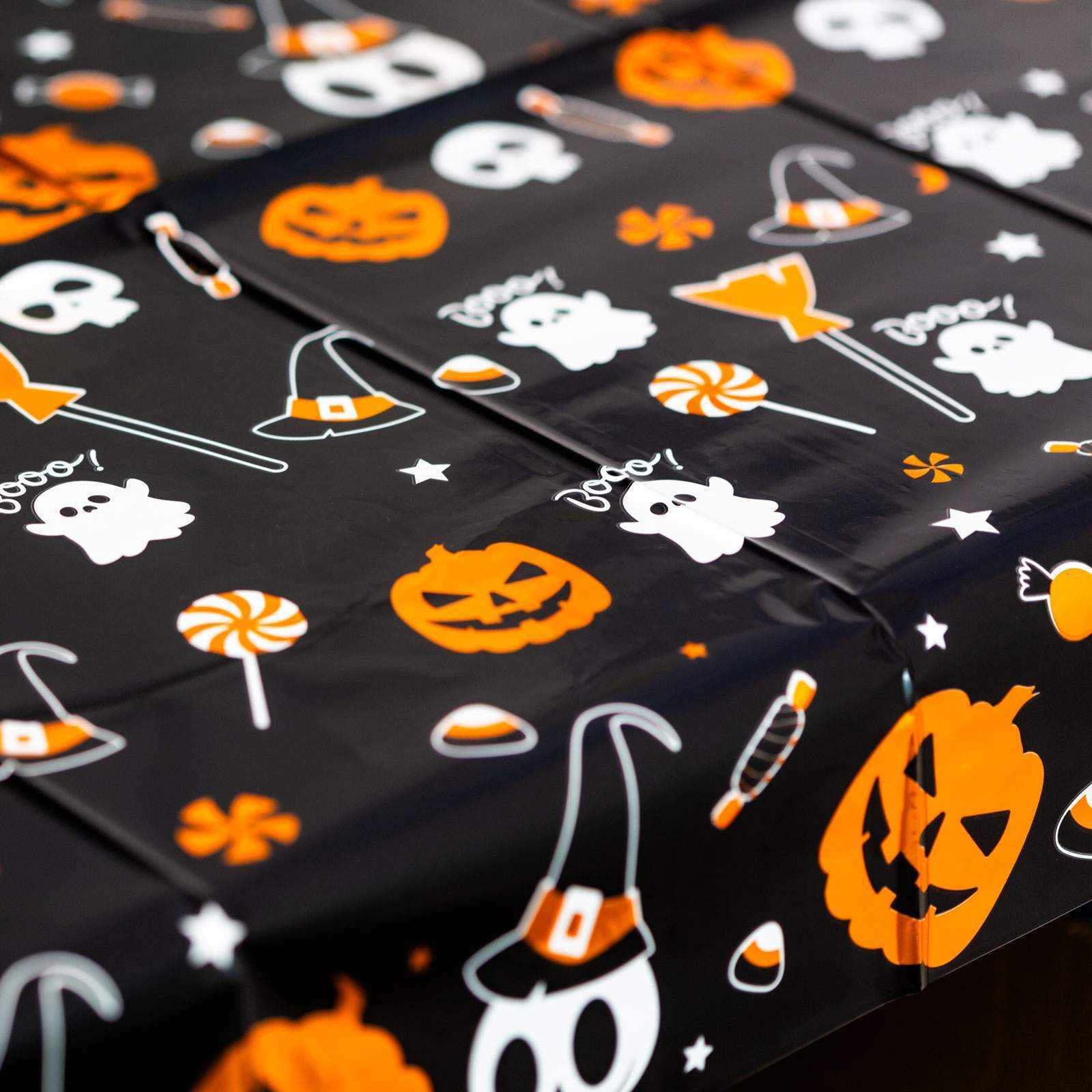 Halloween-i asztalterítő – alumínium hatású – 137 x 183 cm – apró motívumos