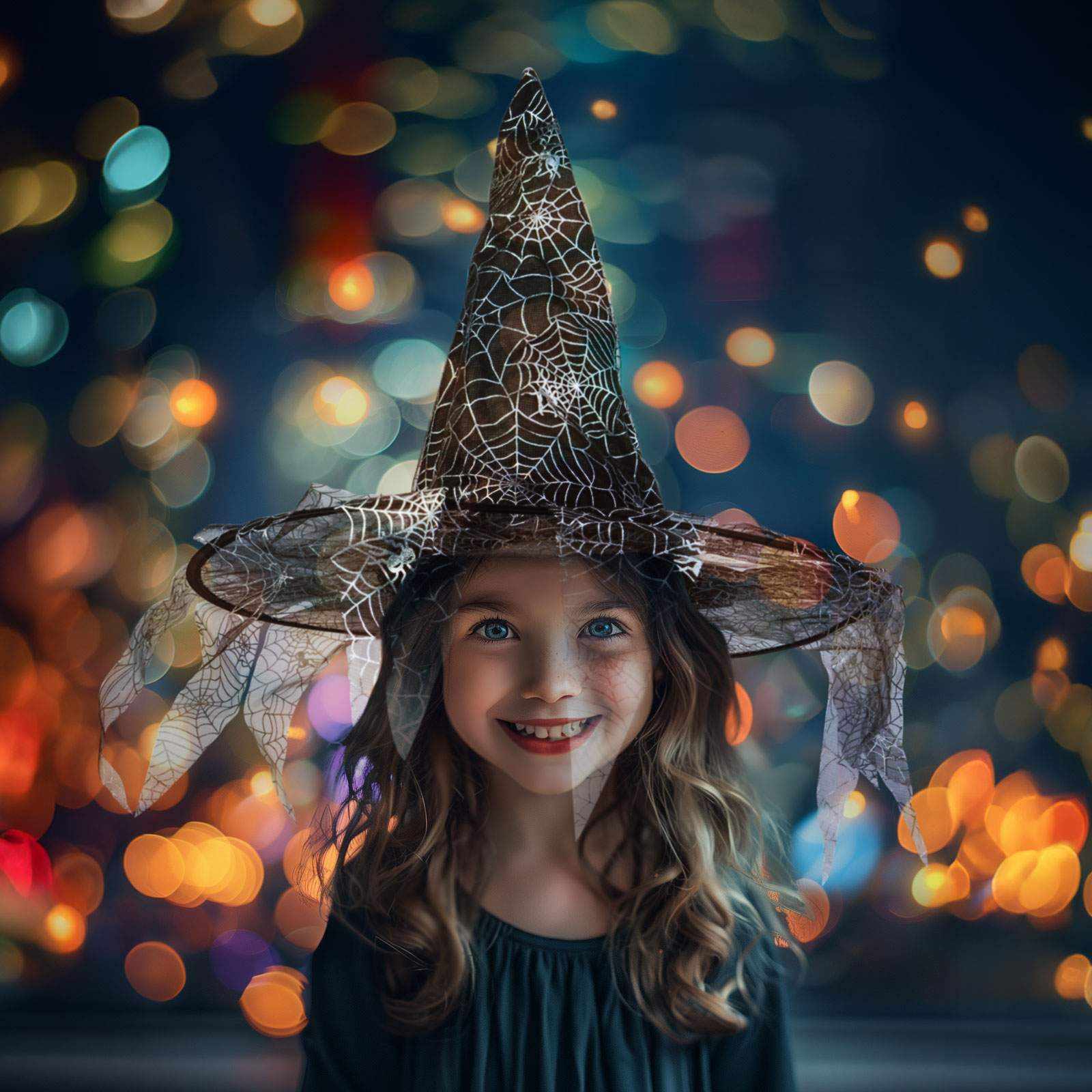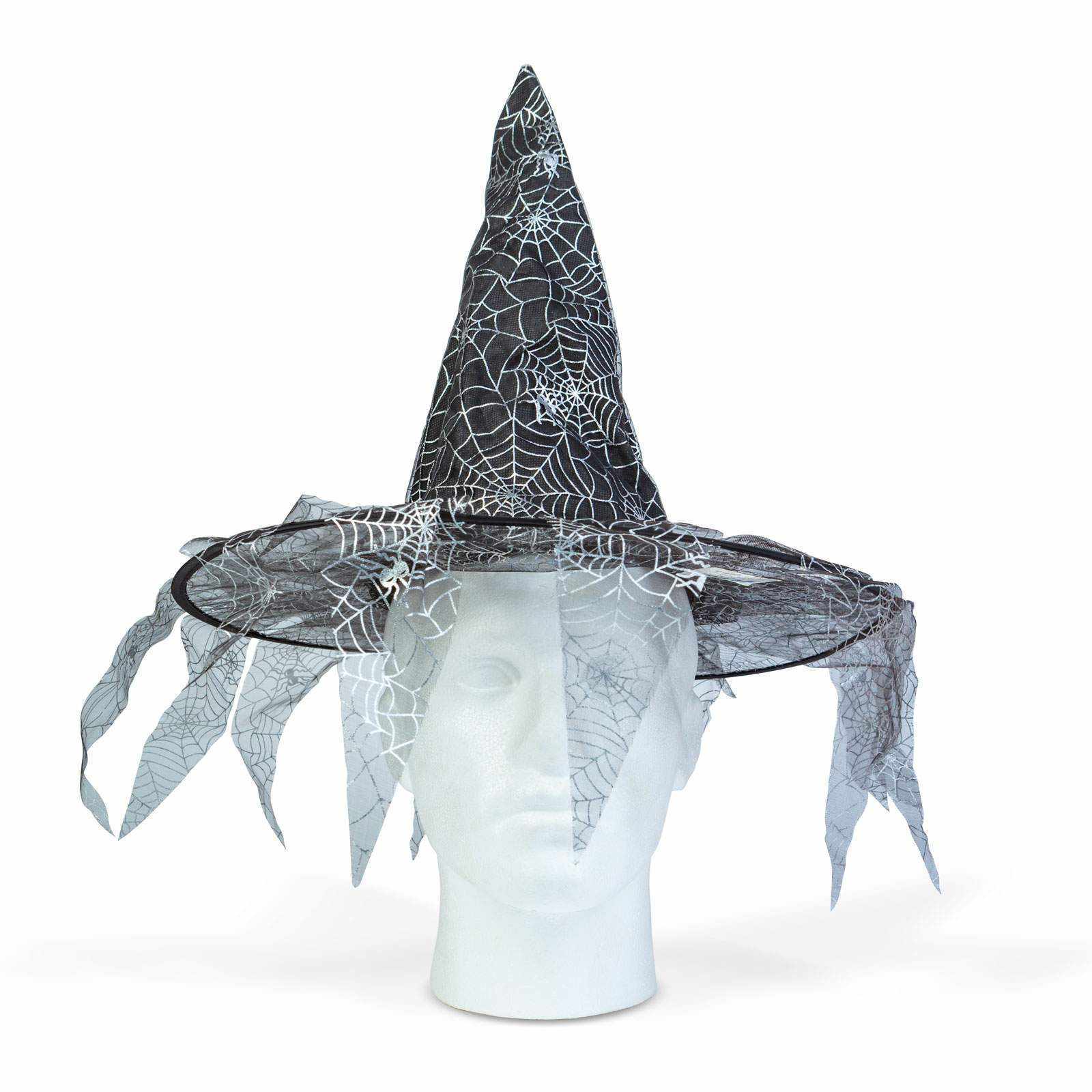 Hegyes, fekete boszorkánykalap, amely kiváló halloween-i jelmez kiegészítő. A kalap külső részén lelógó, fekete, pókhálómintás anyag található.