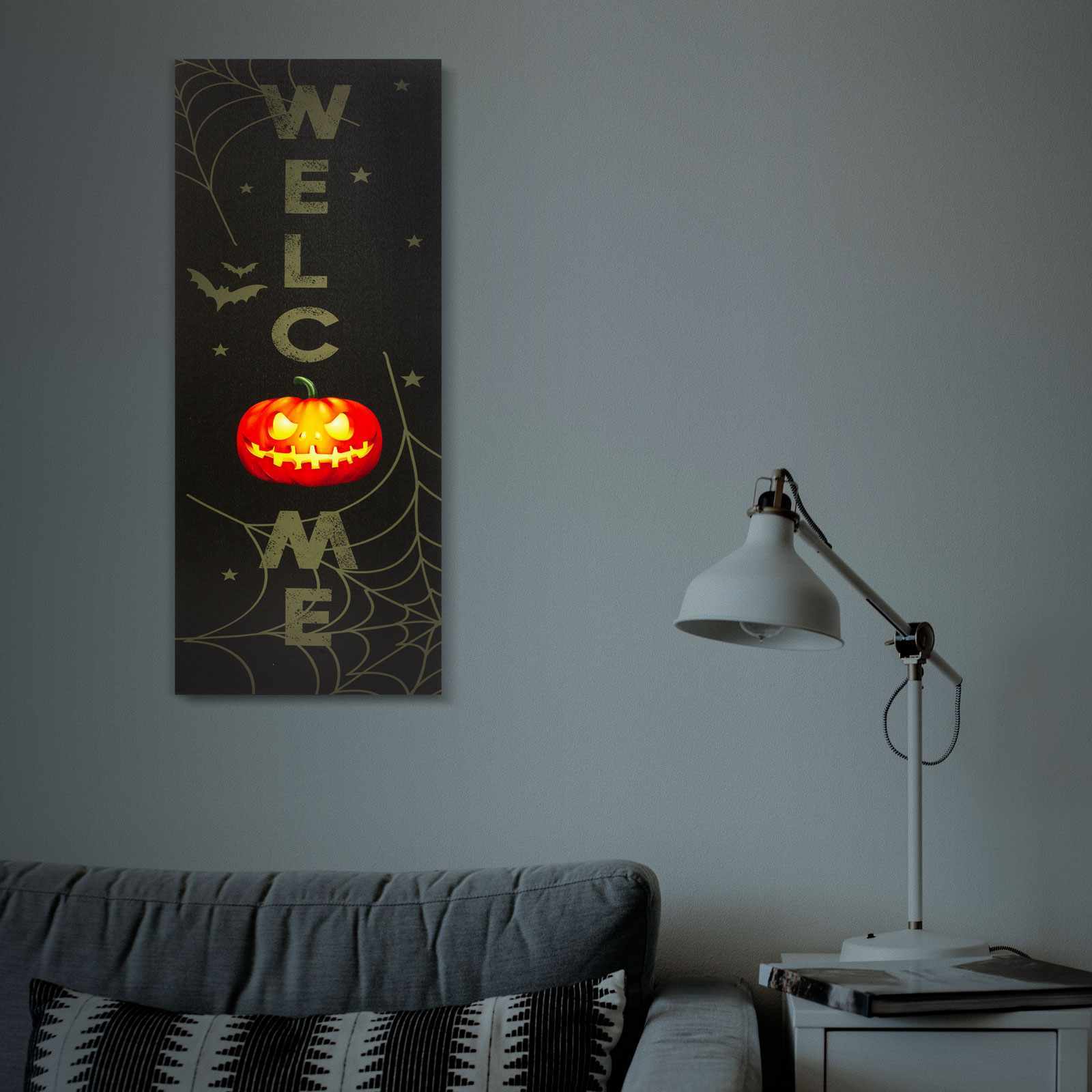 Díszítse sárga LED-es, halloween-i fali képekkel otthonát, irodáját. Ez a különleges fali dekor minden helyiségben jól mutat, egyedivé téve a halloween-i dekorációt. Energiatakarékos LED-es működéséről 2 db AA elem gondoskodik.