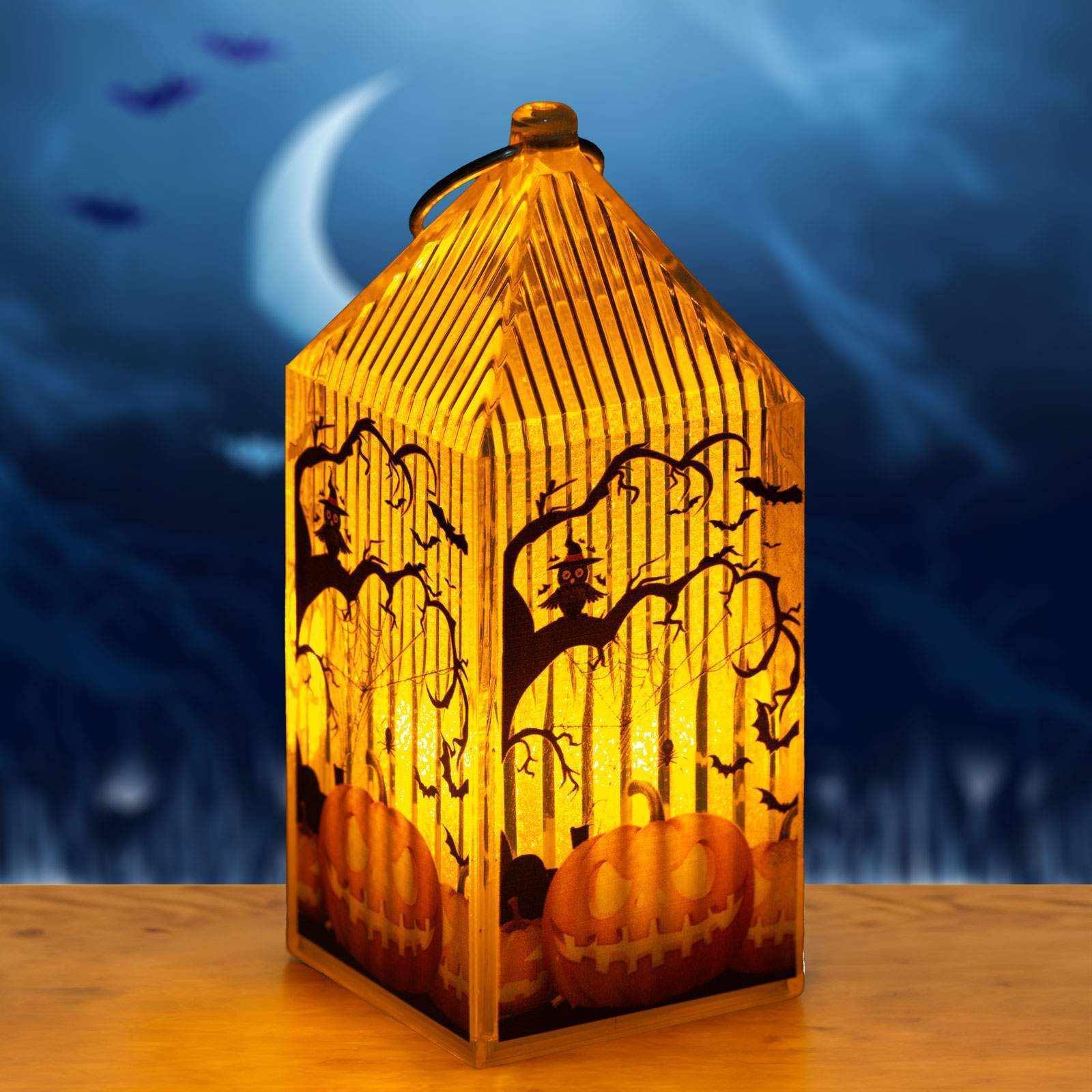Hordozható Halloween-i LED lámpa narancssárga fénnyel! Az alján lévő kapcsoló segítségével kapcsolható be vagy ki. Az átlátszó plexit az alján lévő narancssárga LED kiválóan megvilágítja, életre keltve az oldalán található mintákat, ezáltal teremtve halloween-i hangulatot.