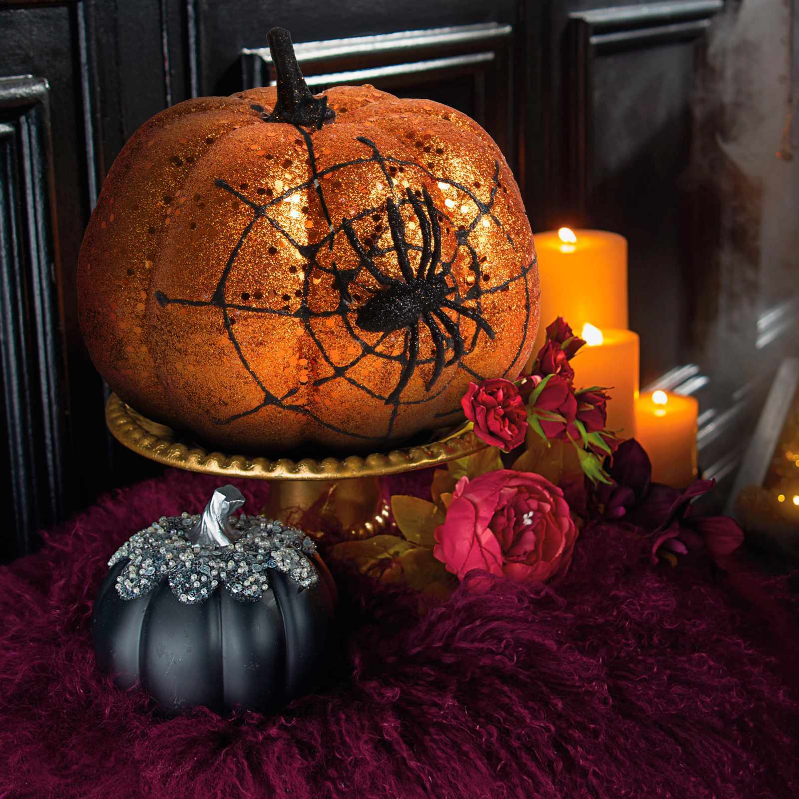 Ez a tök a rajta lévő pókkal egyedülállóan mutatós és stílusos halloweeni kiegészítője lehet otthonának, üzletének, irodájának. A tök glitteres borítása ragyogóan csillog a napfényben és a helyiség LED fényforrásainak köszönhetően éjszaka is látványos hatást kelthet.