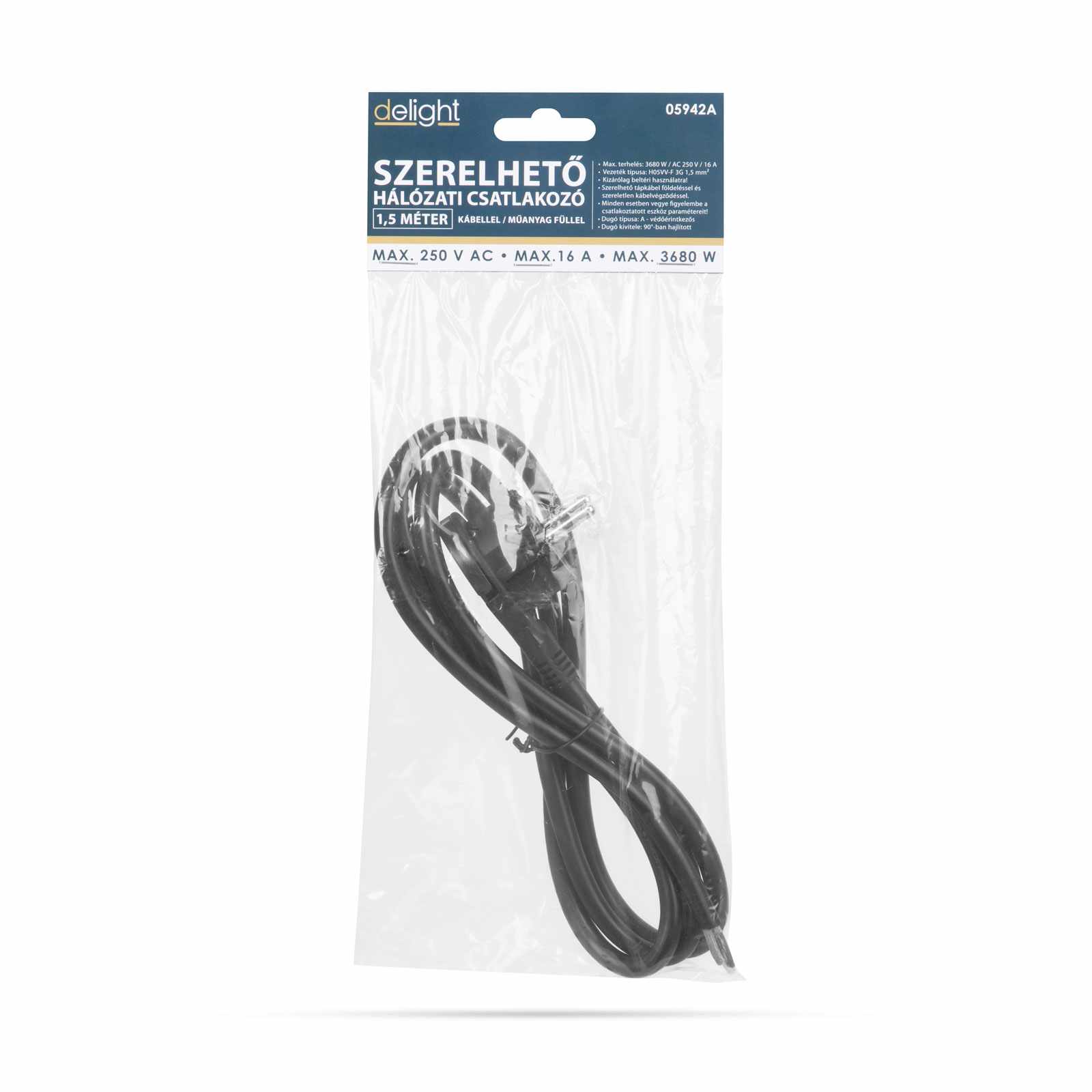 Hálózati szerelhető tápkábel dugóval – műanyag füllel – 1,5 m kábellel – 3 x 1,5 mm2 – fekete Delight 05942A