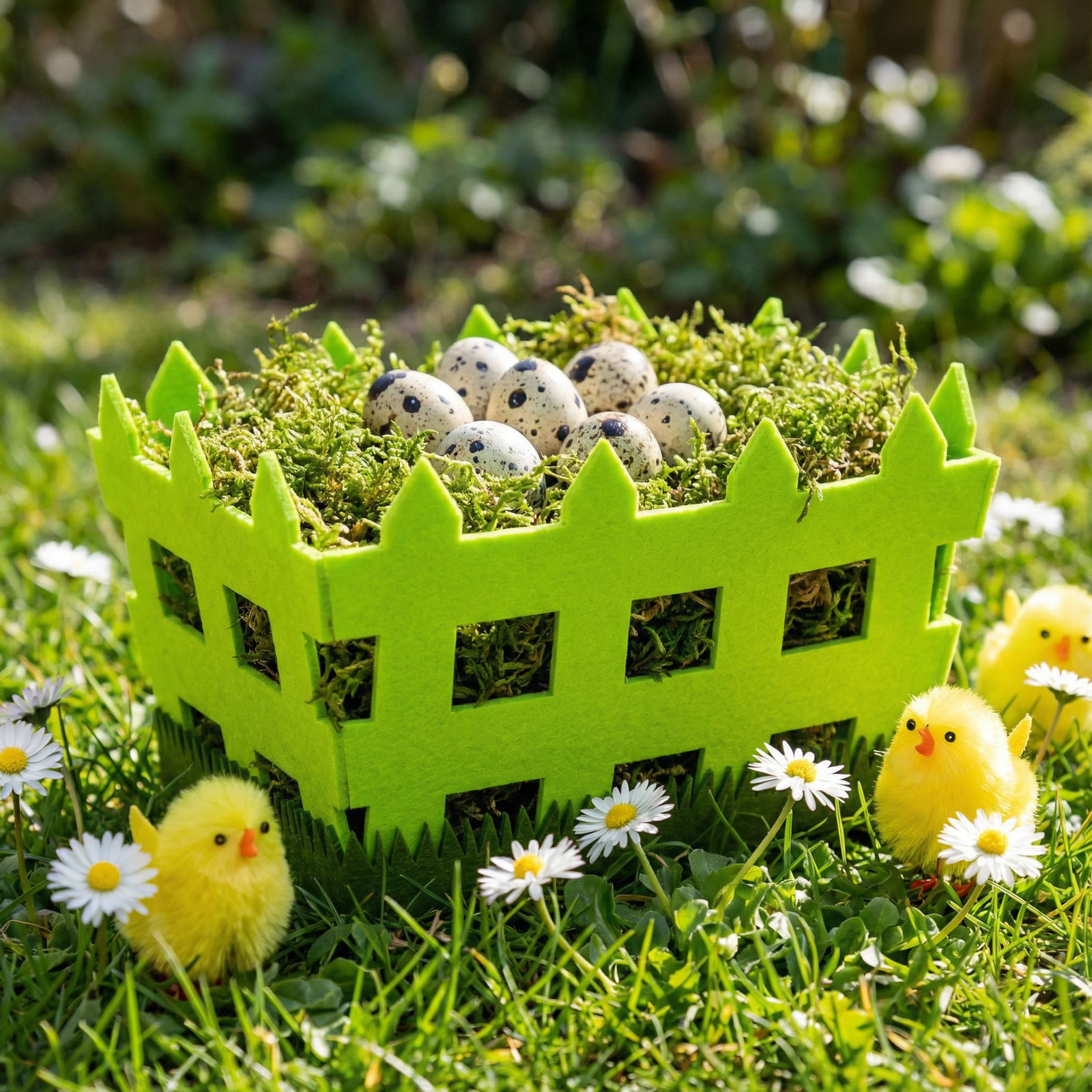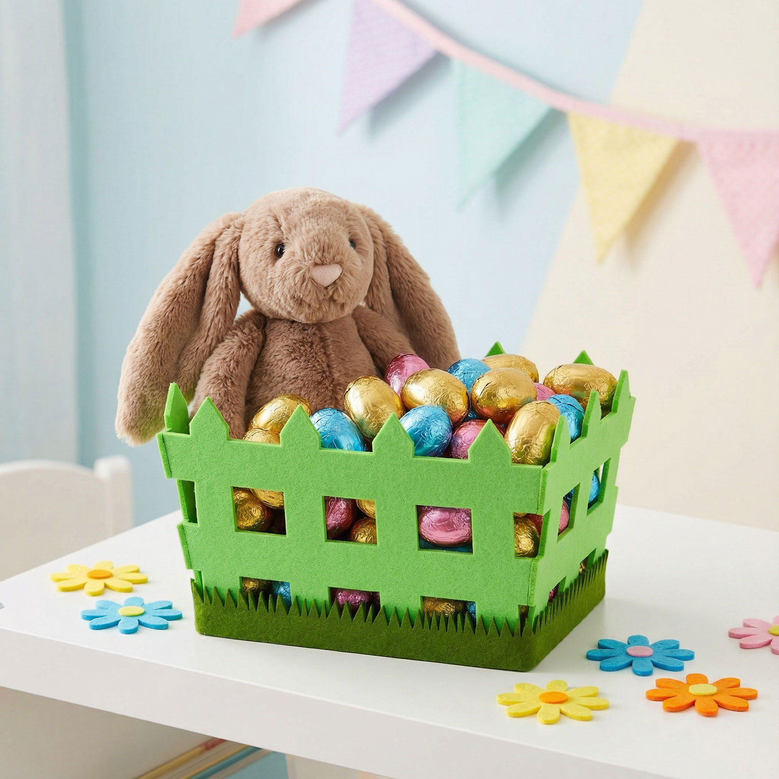 Dobja fel húsvéti dekorációját ezzel az egyedi, kerítés formájú filc kosárral! A kosár ideális édességek, apró ajándékok vagy húsvéti tojások tárolására és kínálására. A filc anyag könnyű, mégis tartós, a kerítés forma pedig vidám és tavaszi hangulatot varázsol. Tökéletes kiegészítője lehet az ünnepi asztalnak, ajándékkosaraknak vagy bármely húsvéti dekorációnak.