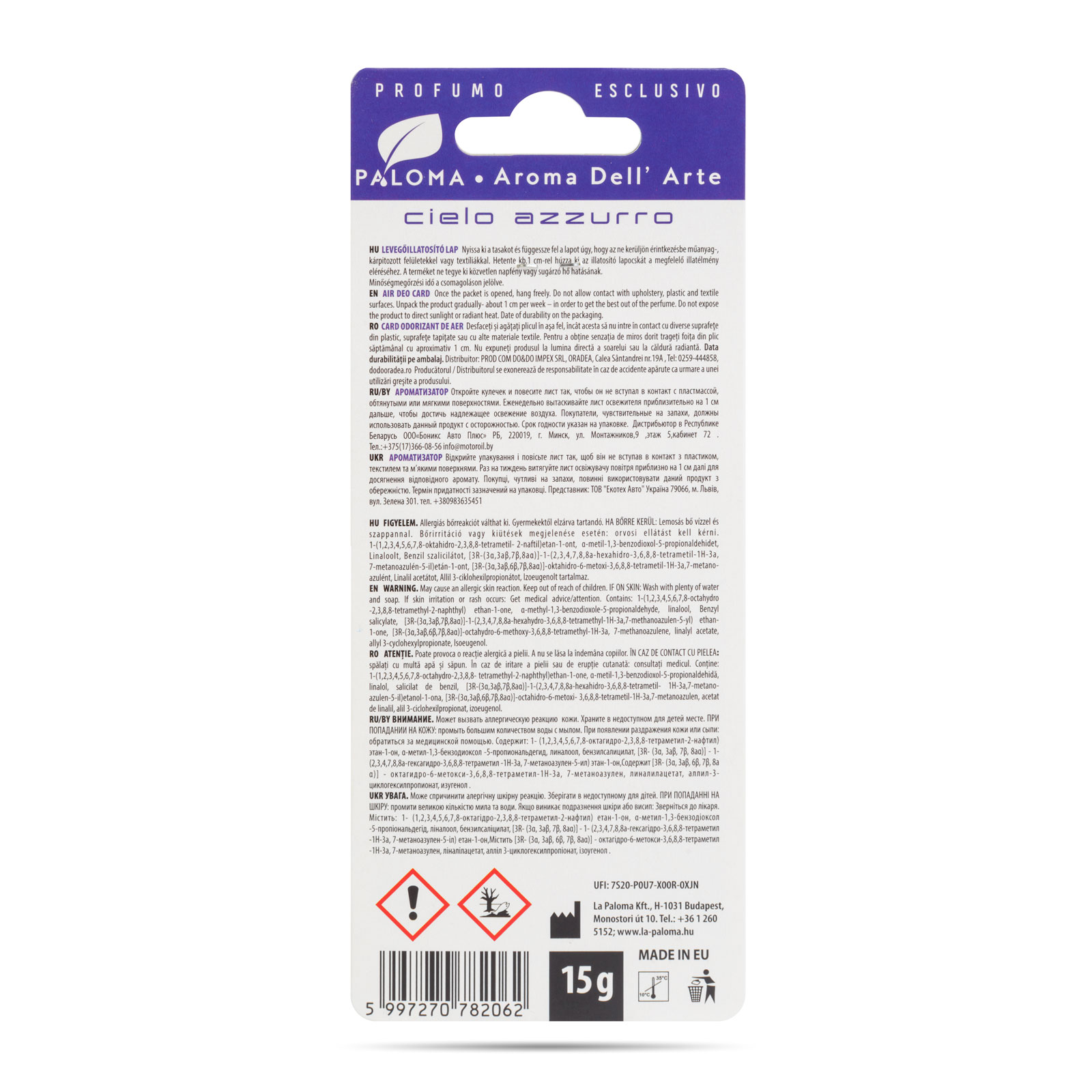 A Paloma Aroma Del ‘Arte illatosító család eleganciájával és kifinomultságával minden utazást különlegessé varázsol! A modern dizájn és a letisztult színvilág egyaránt kifinomult és stílusos megjelenést biztosít autójában. Az illatosító kellemes, friss illatával frissességet és tisztaságot hoz a jármű belső terébe. Ideális választás mindazok számára, akik nemcsak az illatra, hanem az autójuk belső terének harmóniájára is nagy hangsúlyt fektetnek.