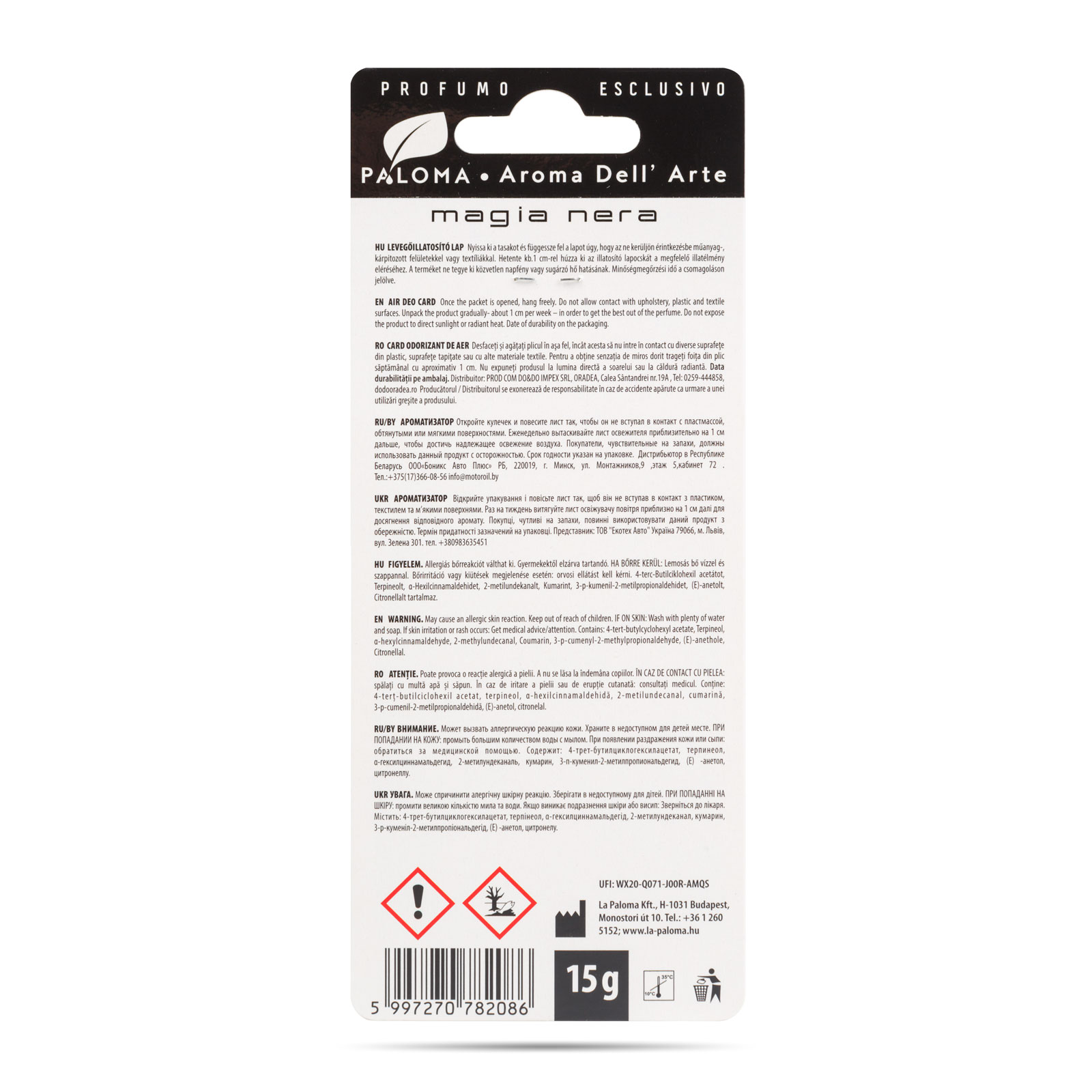 A Paloma Aroma Del ‘Arte illatosító család eleganciájával és kifinomultságával minden utazást különlegessé varázsol! A modern dizájn és a letisztult színvilág egyaránt kifinomult és stílusos megjelenést biztosít autójában. Az illatosító kellemes, friss illatával frissességet és tisztaságot hoz a jármű belső terébe. Ideális választás mindazok számára, akik nemcsak az illatra, hanem az autójuk belső terének harmóniájára is nagy hangsúlyt fektetnek.