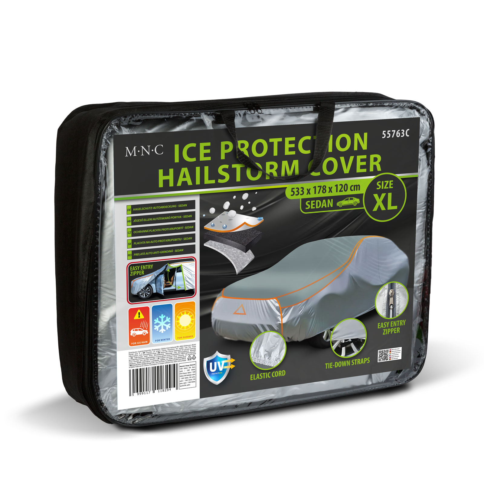 Védje autóját az időjárás viszontagságaitól ezzel a kiváló minőségű, jégeső elleni autótakaró ponyvával! A ponyva védelmet nyújt a jégeső, UV-sugárzás, eső és por ellen, így hosszú távon óvja autója karosszériáját és fényezését. A takaró 150D Oxford szövetből és 4 mm vastag EVA habrétegből készült, amely hatékonyan csillapítja a jég, faágak okozta ütődéseket, miközben biztosítja a megfelelő szellőzést is. Használatával megelőzhető a karosszéria sérülése, szennyeződése is. A beépített háromszög alakú fényvisszaverő logó javítja a láthatóságot, a két rögzítőpánt pedig biztosítja, hogy a ponyva erős szélben is stabilan a helyén maradjon. Az oldalán található cipzáras rész segítségével könnyen bejuthat az gépjárműbe a ponyva eltávolítása nélkül.