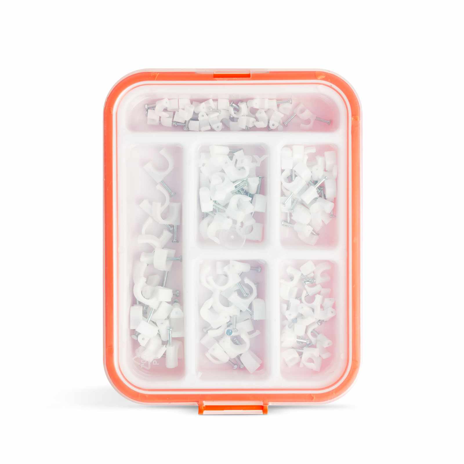 Öntött PVC kábelkapocs, beépített szeggel, ezáltal könnyen és gyorsan rögzítheti 5 és 10 mm átmérő közé eső kábeleit. Használható szegőkre, falra, fára történő tetszőleges vonalvezetésű vezeték rögzítésre. A praktikus átlátszó doboztető nagyfokú áttekinthetőséget biztosít.