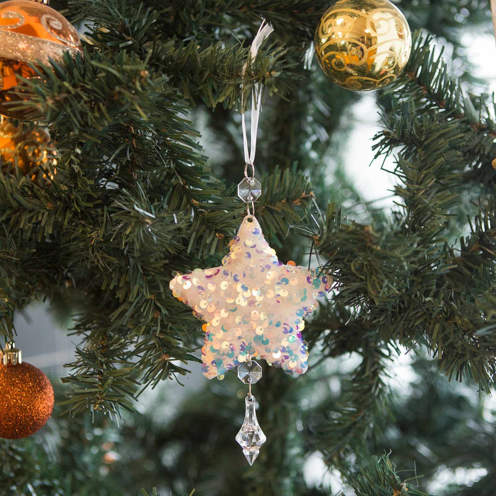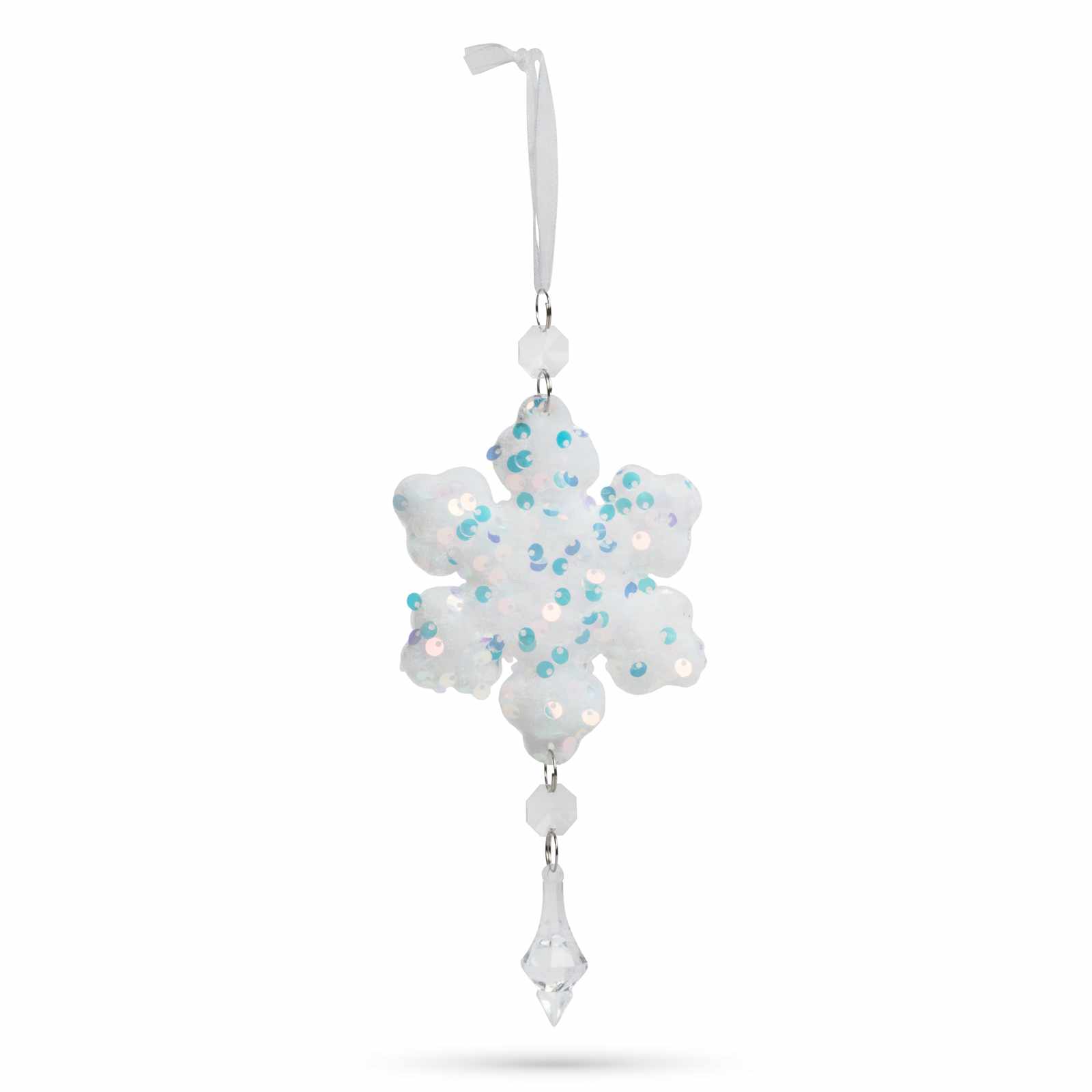 Klasszikus karácsonyi hópehely, csillag dísz, amely bármelyik karácsonyfa ékes dísze lehet. A glitteres felületen megcsillanó fények meghitt hangulatot teremtenek és ragyogással töltik be a karácsonyfát. A fénytörléseknek köszönhetően lilás, sárgás színekben játszik, attól függően, hogyan esik rá a fény.