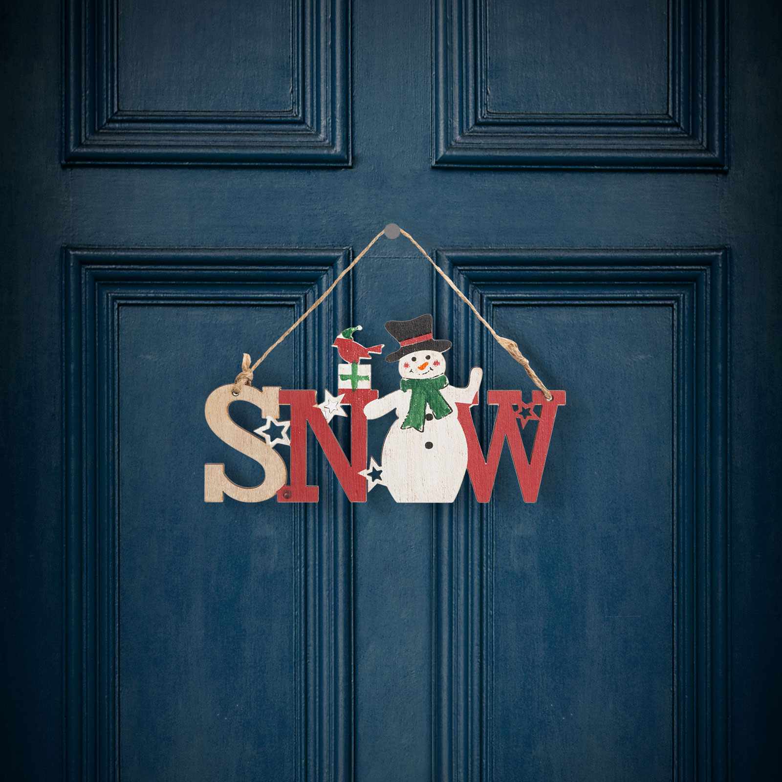 Karácsonyi dekoráció fából, „SNOW” felirattal és aranyos hóember mintával. Madzag akasztójának köszönhetően akár ajtódíszként is funkcionálhat, de lakása bármely helységében elhelyezheti.
