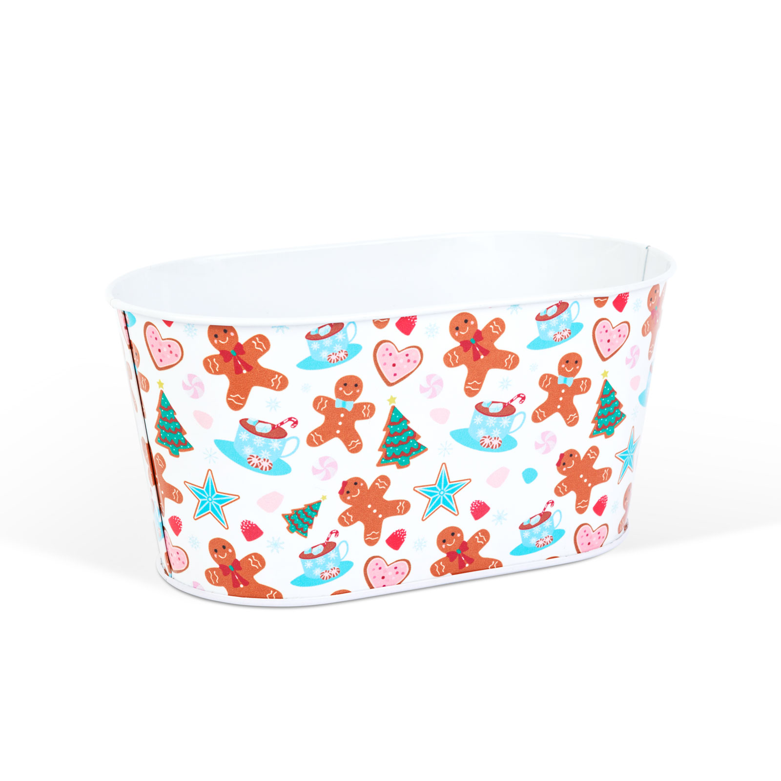 Ez a vidám, mézeskalács mintás karácsonyi fém kosár tökéletes választás az ünnepi időszakra! Használhatja sütemények, apró ajándékok, édességek vagy akár dekorációk tárolására is. A tartós, fém anyag strapabíróvá teszi, a színes mintázat pedig, ünnepi hangulatot teremt. Elhelyezhető asztalon, polcon vagy komódon – bárhol jól mutat!