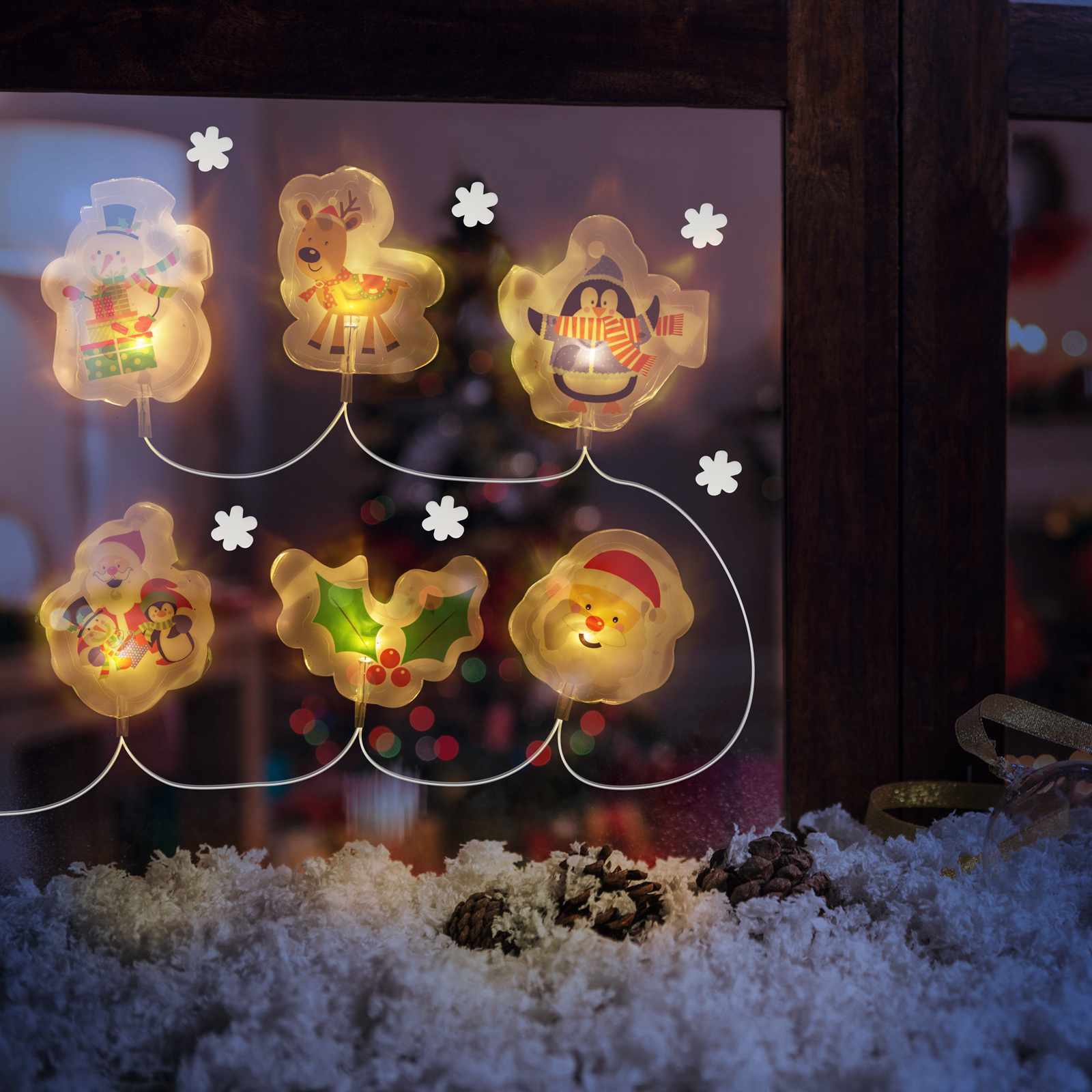 Dekorálja ablakát, hűtőszekrényét az ünnep közeledtével karácsonyi témájú fényfüzérrel. A vidám karácsonyi motívumokat melegfehér fény világítja meg, így éjszaka is varázslatos látványt nyújtanak. A különböző figurák gél állagúak és ragasztóanyag nélkül ragadnak, majd nyom nélkül eltávolíthatóak ha már nincs szüksége rájuk. A szett része 6 db hópehely is, amelyek a fényfüzértől függetlenül bárhová elhelyezhetőek.