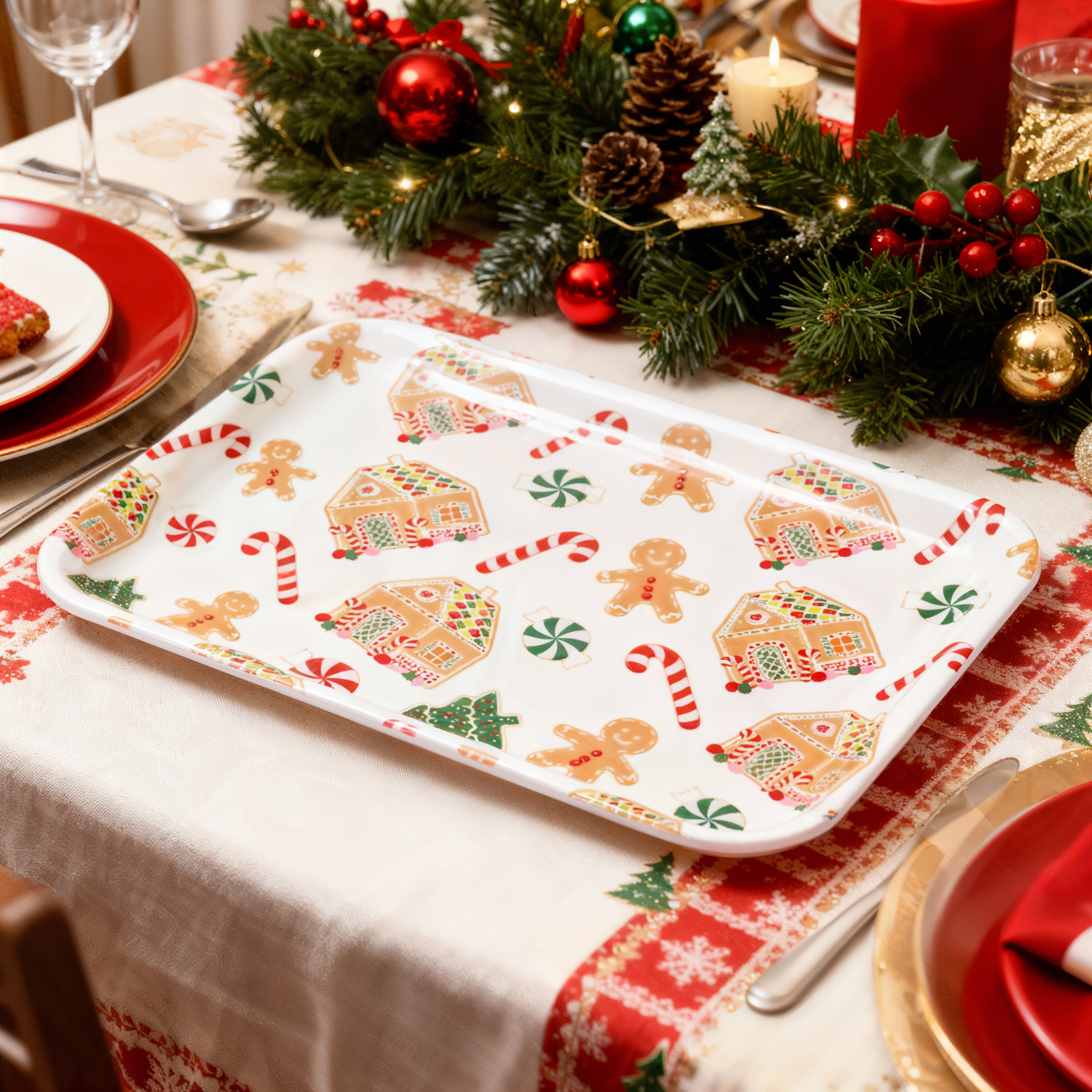 Varázsoljon ünnepi hangulatot asztalára ezzel a vidám karácsonyi kínálótálcával! A strapabíró műanyagból készült tálca tökéletes sütemények, édességek, gyümölcsök vagy egyéb finomságok stílusos felszolgálásához. A tálca felületét bájos karácsonyi minták díszítik, például mézeskalács figurák, karácsonyfák és cukorbotok, amelyek garantáltan meghitt és ünnepi hangulatot teremtenek. Könnyű súlyának és praktikus, peremes kialakításának köszönhetően kényelmesen használható mindennapi és ünnepi alkalmakon egyaránt.