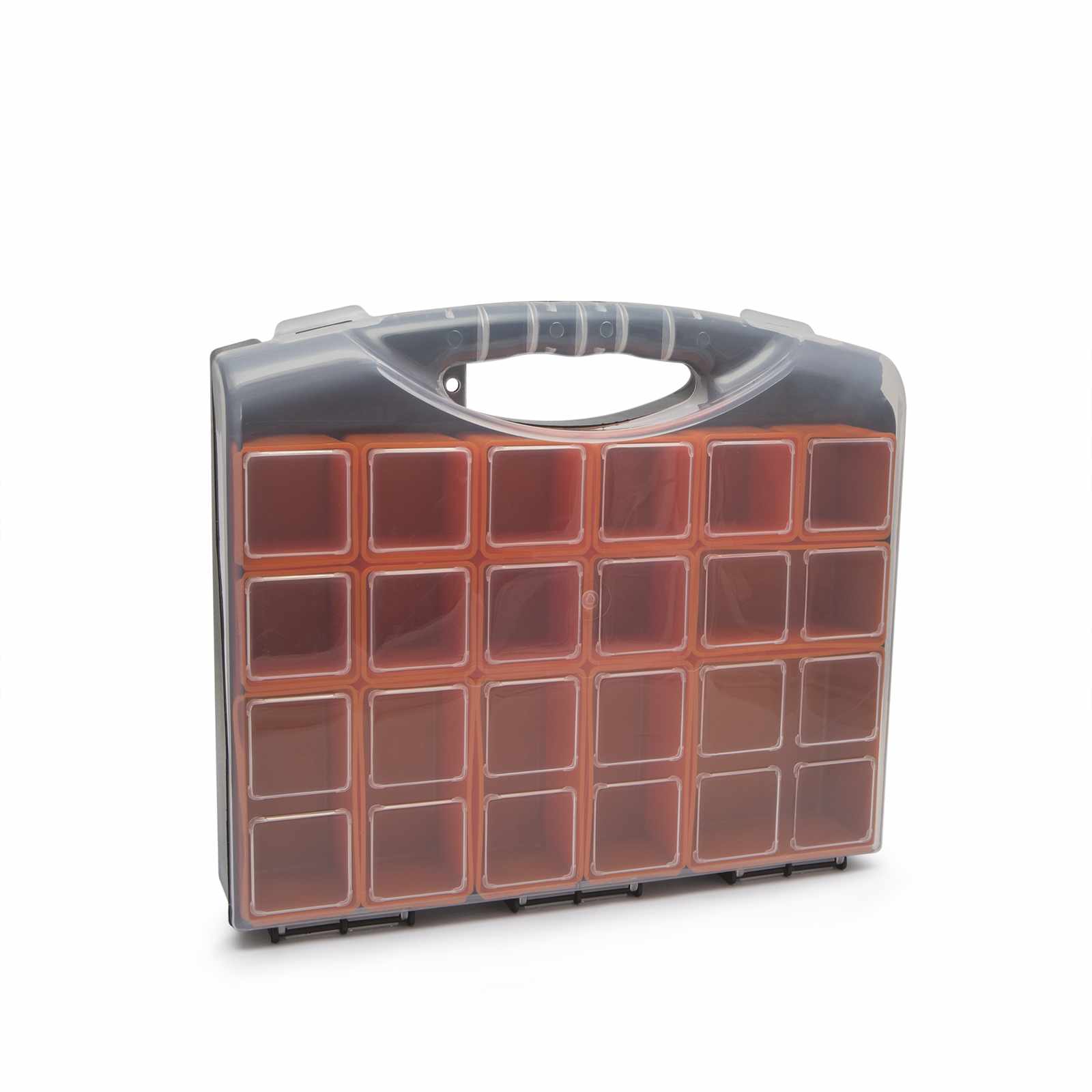 - 10 db 4.5 x 4.5 cm, 5 db 9.5 x 4.5 cm és 1 db 9.5 x 9.5 cm narancs színű kivehető, variálható elrendezésű tárolódoboz