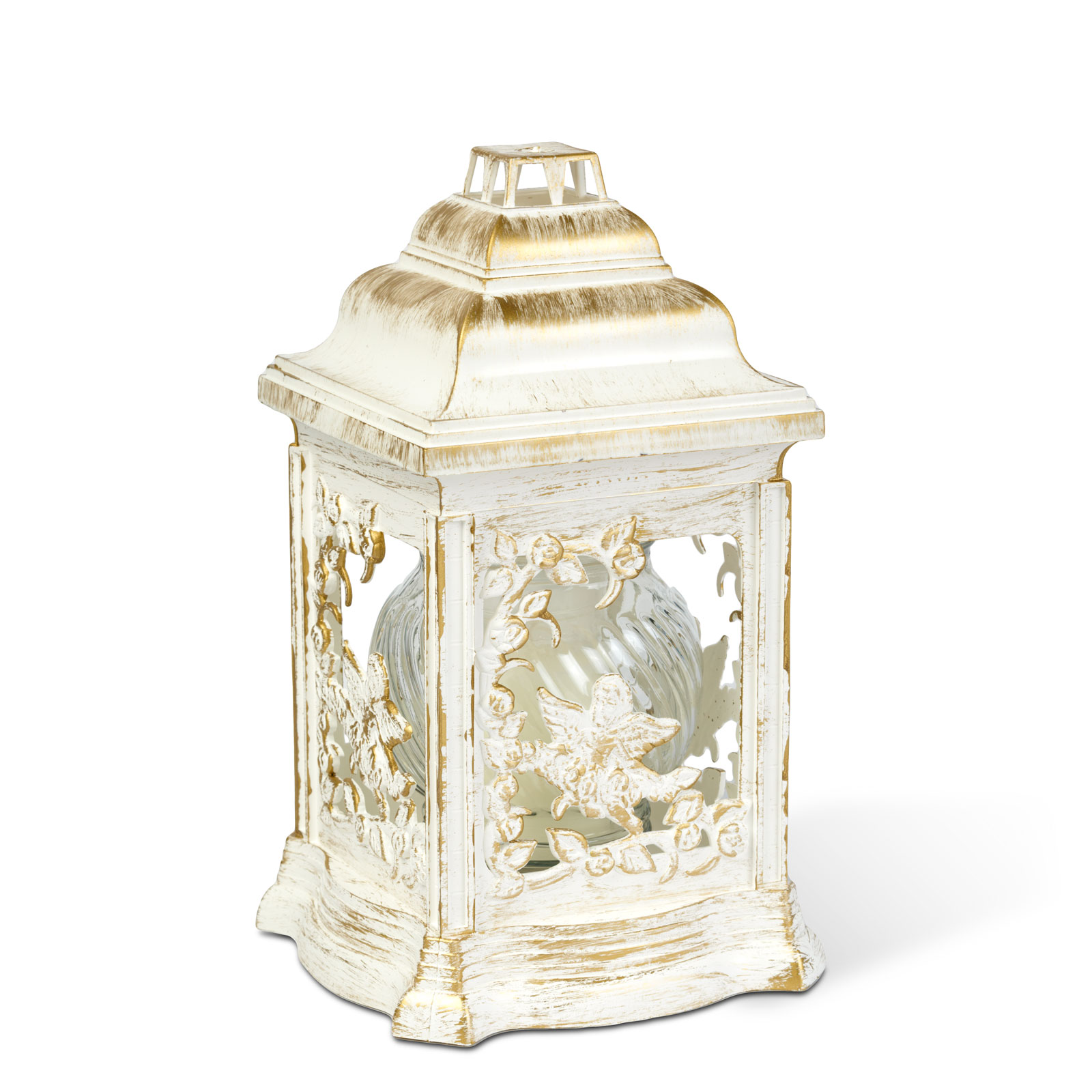 Műanyag katedra mécses – angyalos mintával, belül üveg mécsessel, szín: fehér – arany antik – 25 cm TW1020