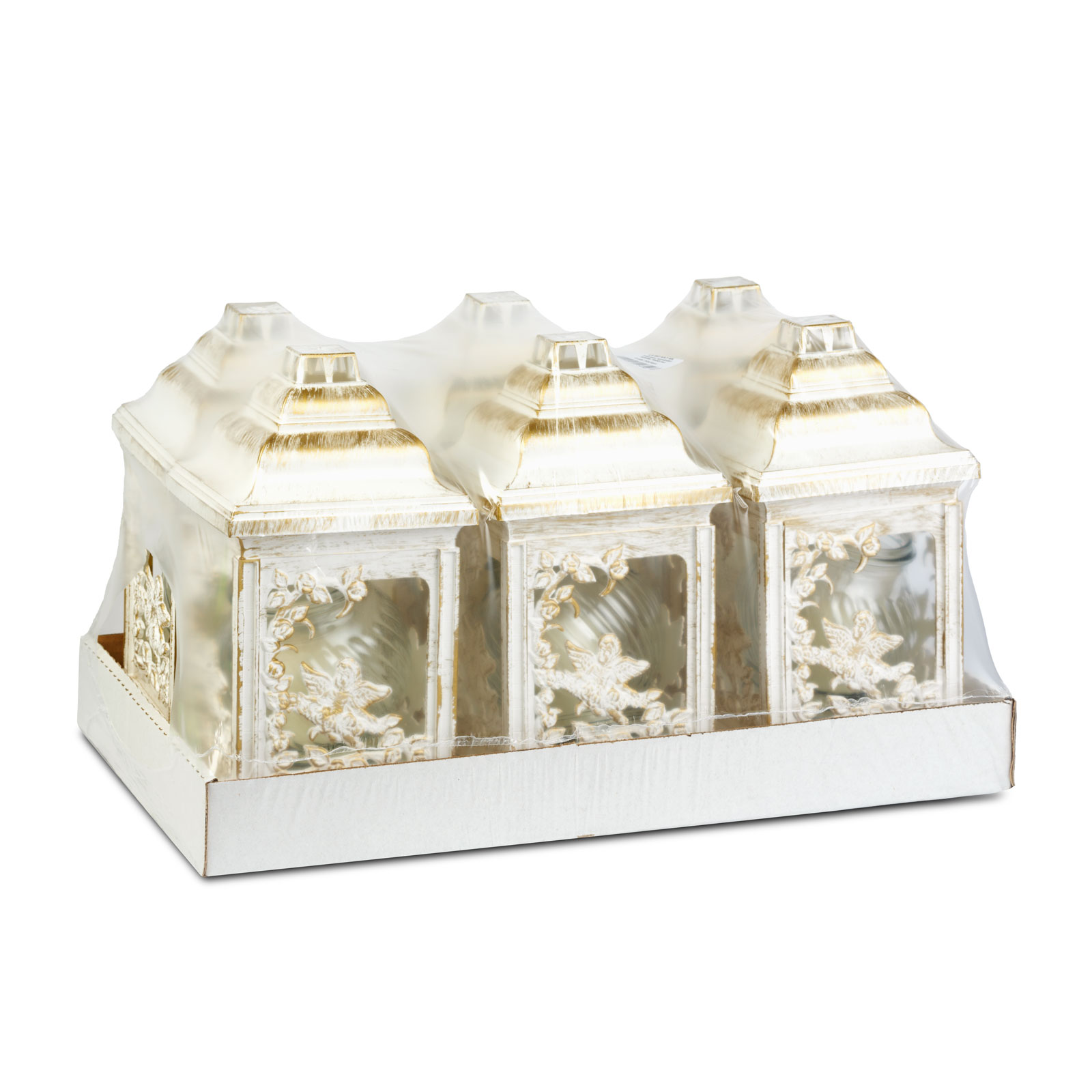Műanyag katedra mécses – angyalos mintával, belül üveg mécsessel, szín: fehér – arany antik – 25 cm