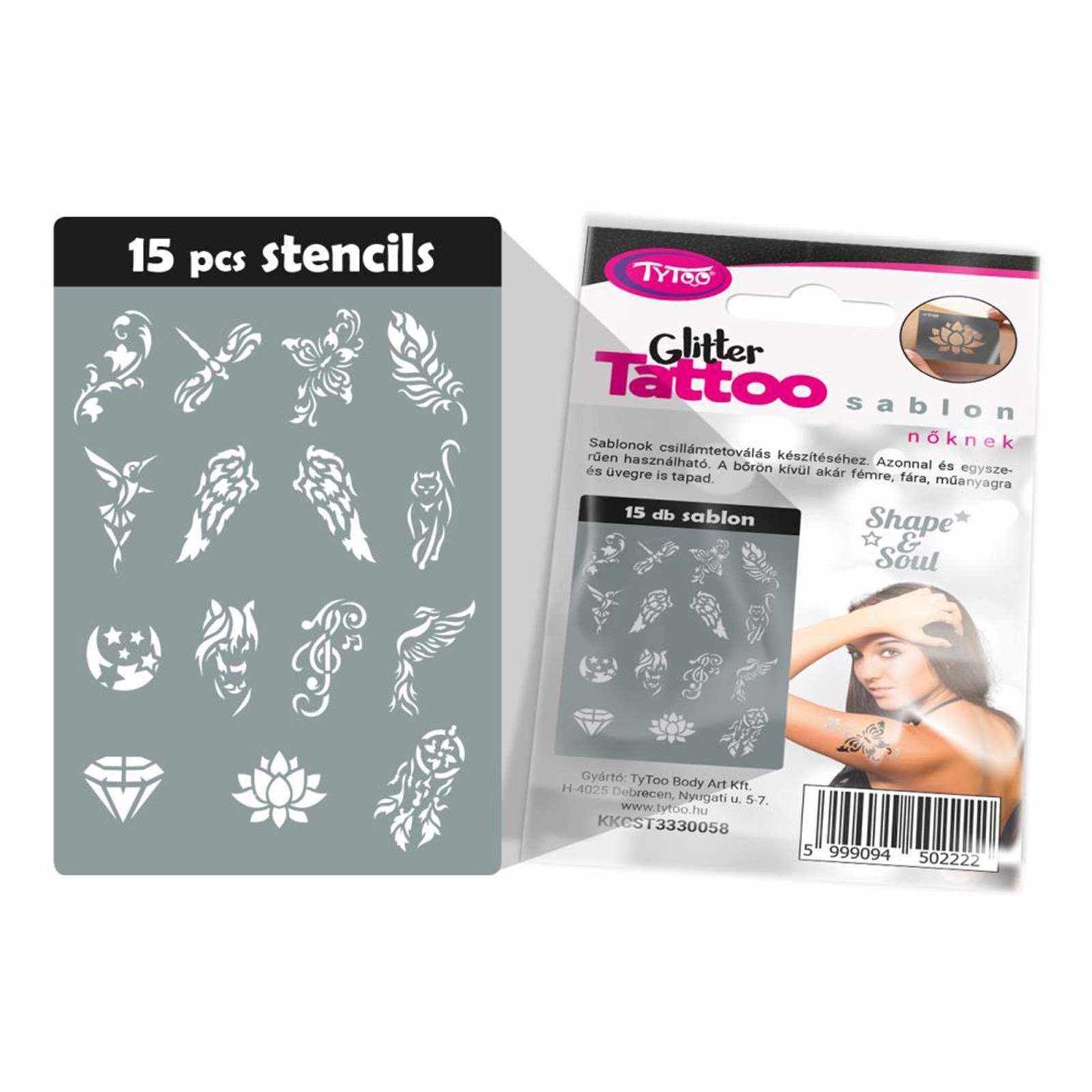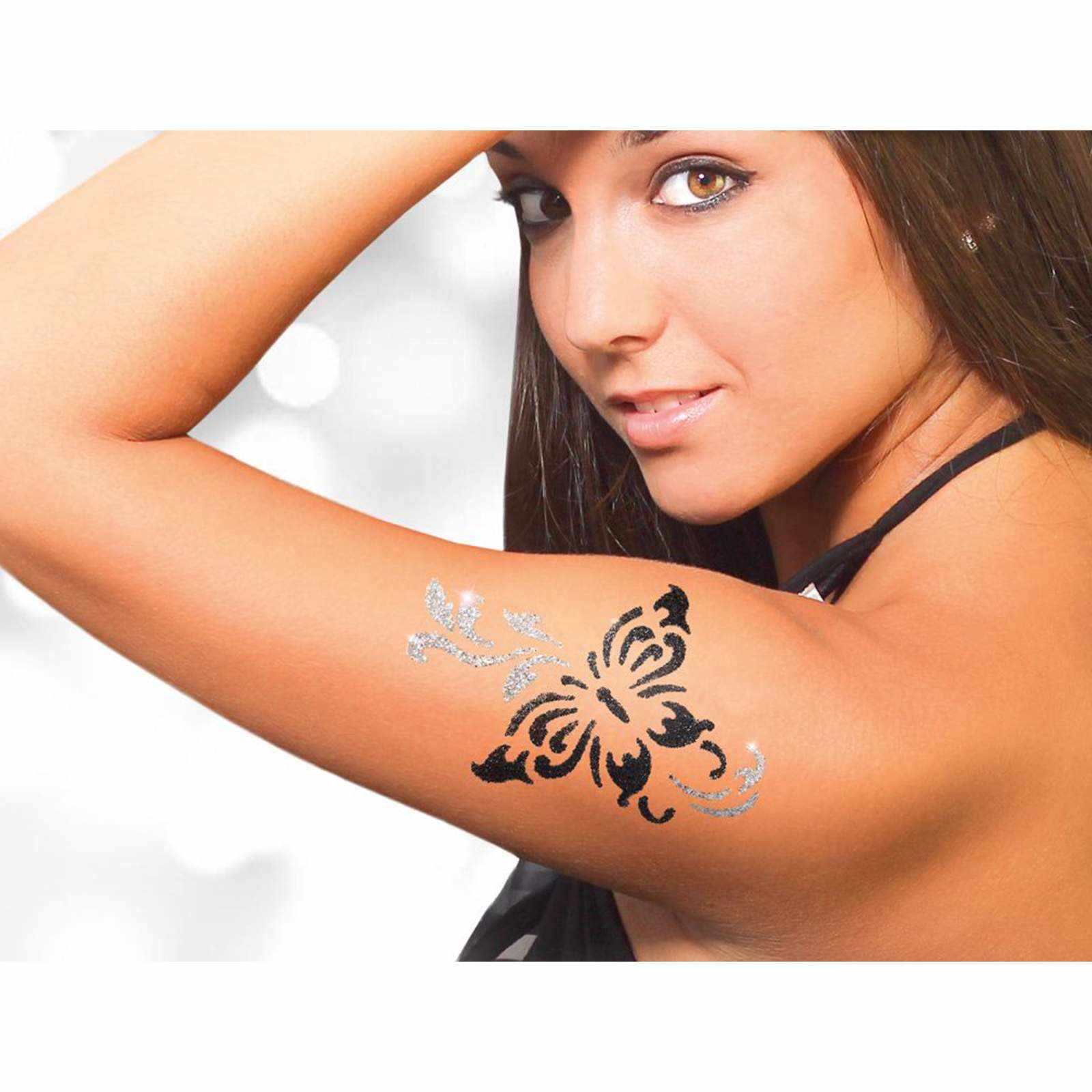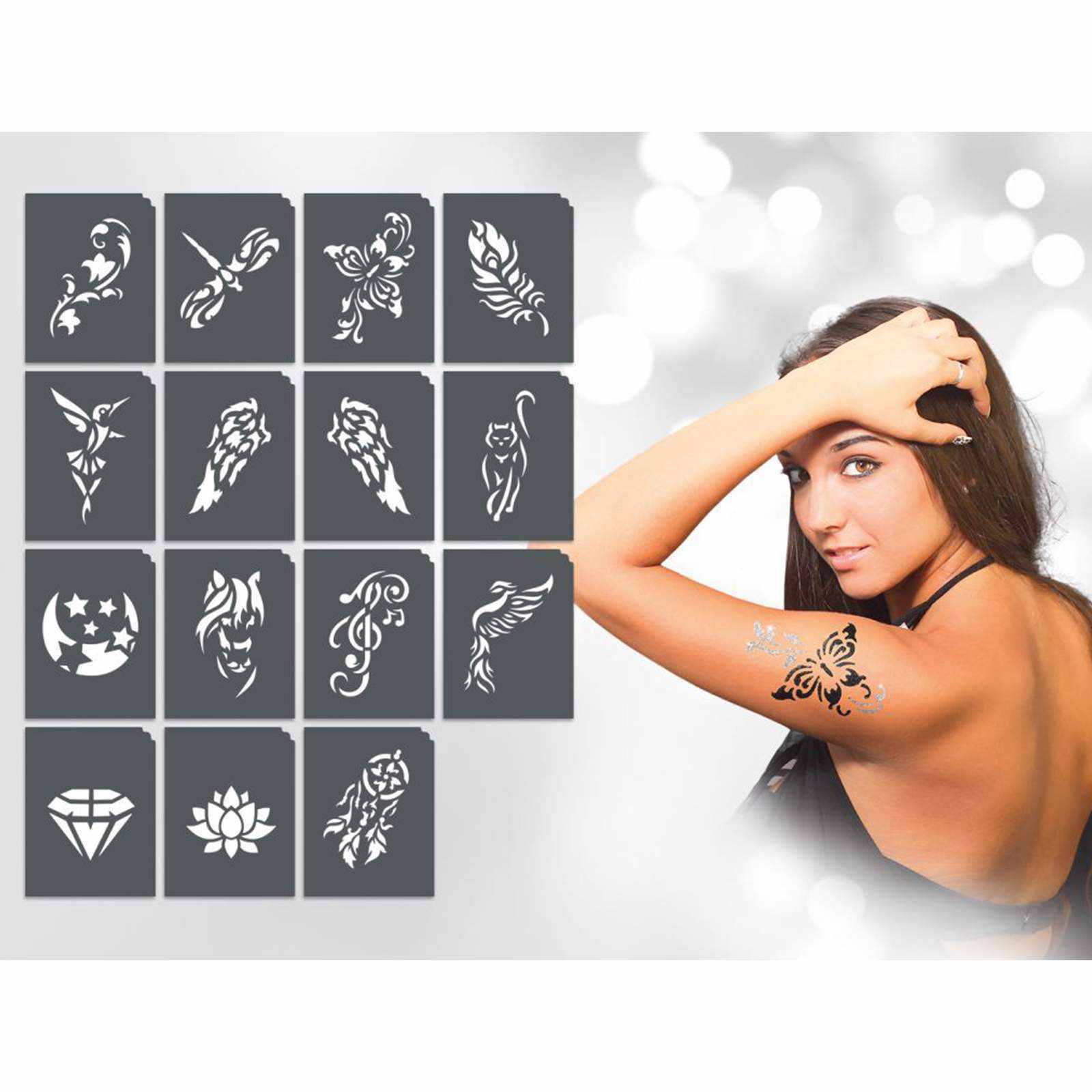 A csomagban található sablonok segítségével női csillámtetoválás mintákat készíthet, melyeket egyéb testfestéshez is felhasználhat.
