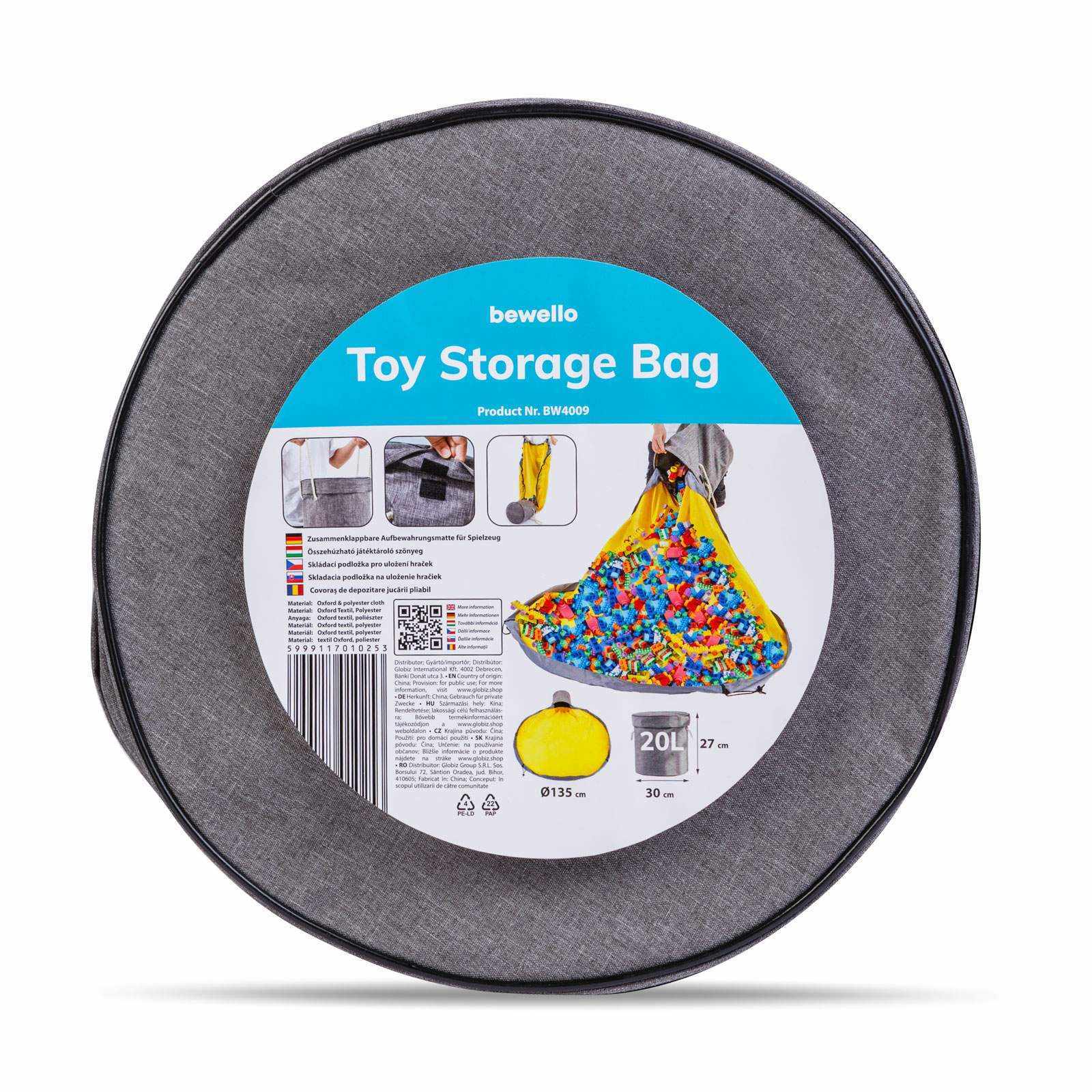 Különféle játékok praktikus tárolására alkalmas játszószőnyeg és tároló. A kosár 30 cm átmérőjű, így könnyen ki és be rakhatóak a játékok. A szőnyeg nagy méretének köszönhetően sok játék elfér rajta. Strapabíró oxford textilből és poliészterből készült. Alkalmas lehet építőkockák, kisautók, babák, társasjátékok, egyeb játékok tárolására is.