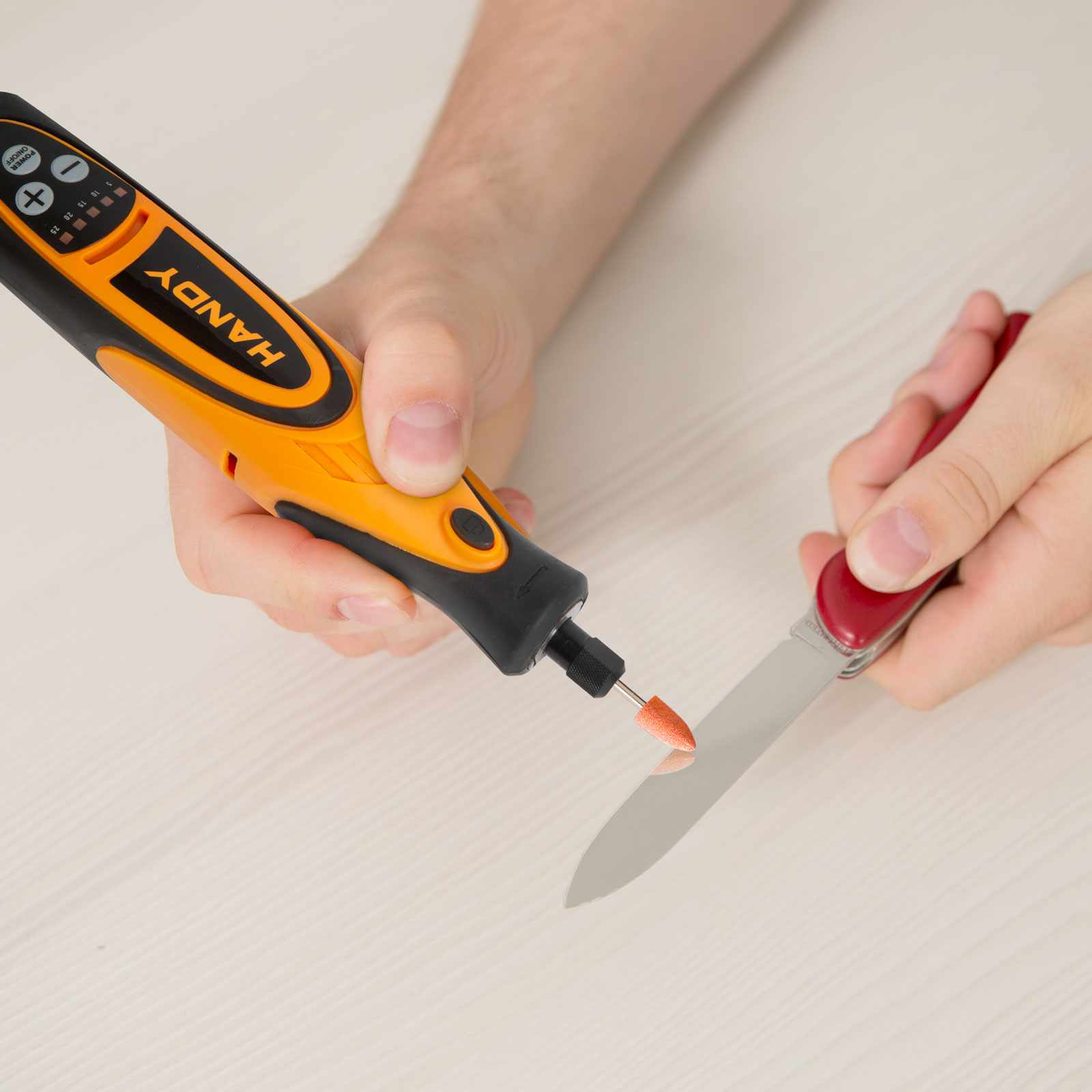 A HANDY DRILL csiszoló, gravírozó és fúrógép kifejezetten otthoni, manikűr/pedikűr és barkács célra lett kifejlesztve. A beépített akkumulátornak köszönhetően, kábelek nélkül, bárhol használhatja a szerszámot. Segítségével kisebb furatokat készíthet, csiszolhat, polírozhat, gravírozhat vagy akár vághat. Ideális lehet sorjás élek eltávolításához. Maximális furat befogadó képessége Ø3,2 mm. A különféle kiegészítők egyszerűen és gyorsan csatlakoztathatók. Kompakt, kis méretének és súlyának köszönhetően könnyen kezelhető a szerszám akár nehezen hozzáférhető helyeken is. Alkalmas lehet fa, fém, műanyag precíz megmunkálására is.