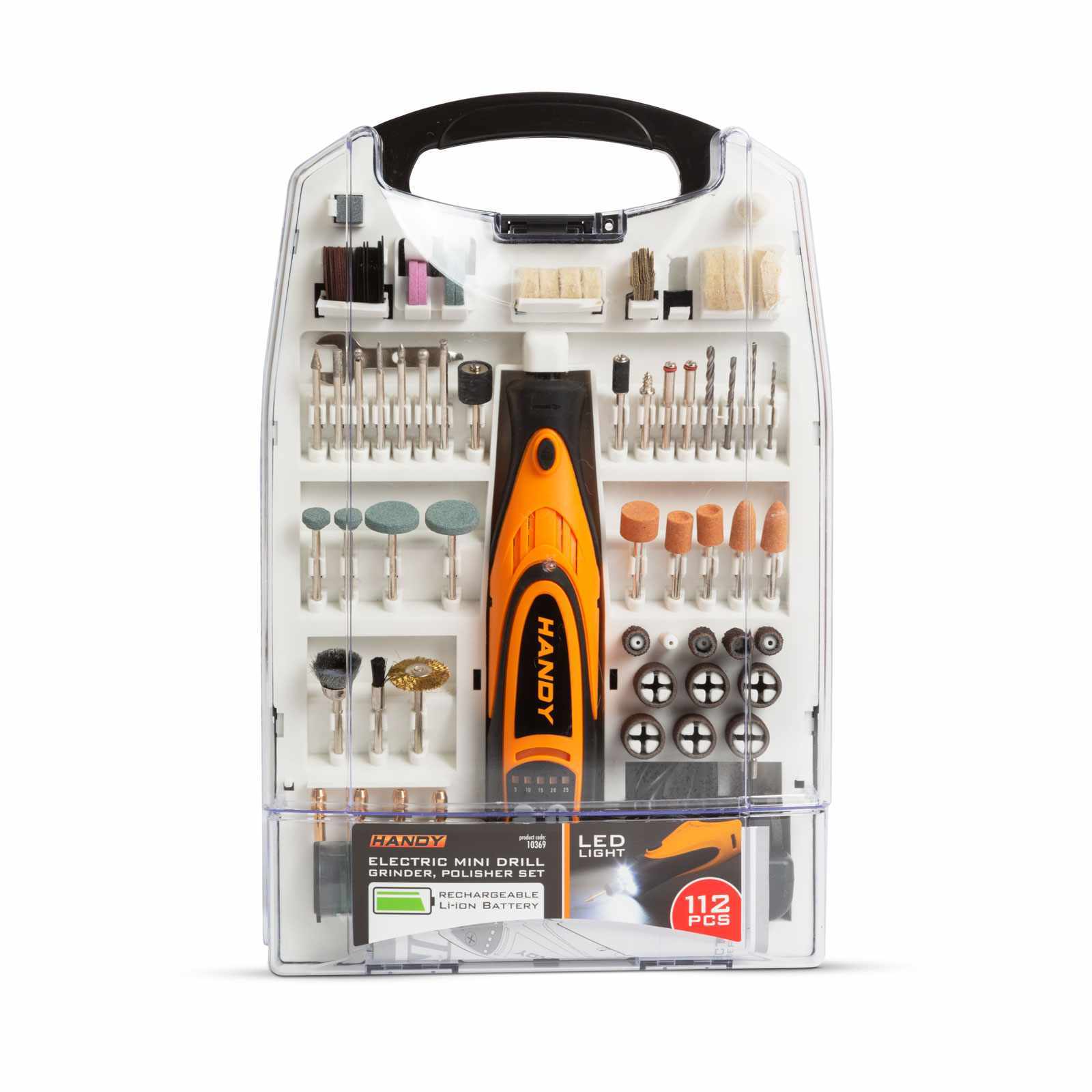 Panelfúró, csiszoló, polírozó szett – 112 részes – akkumulátoros Handy 10369