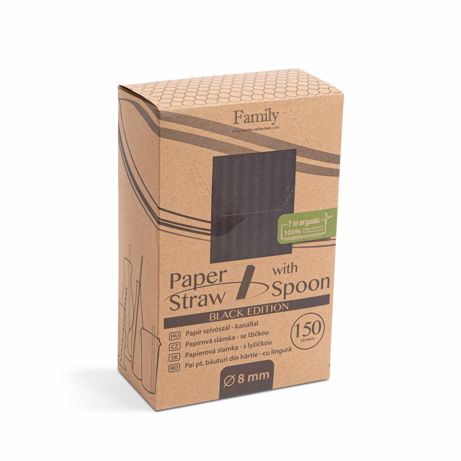Papír szívószál – fekete, kanállal – 200 x 8 mm – 150 db / csomag Family 57604A