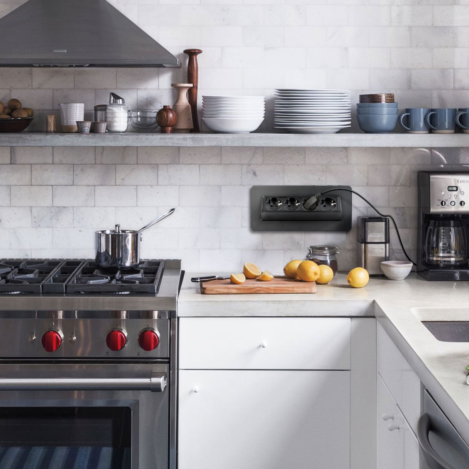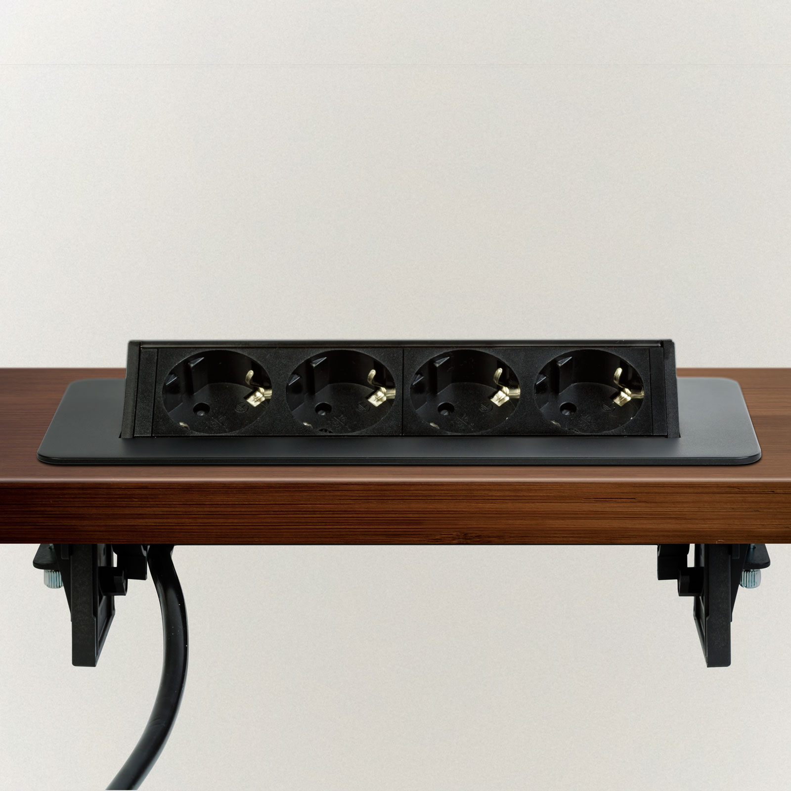 Süllyeszthető elosztó irodai és otthoni felhasználásra, matt fekete felülettel, 4 db gyermekvédelemmel ellátott aljzattal. Asztala, bútora legyen mindig elegáns és rendezett, mégis funkcionális. A rejtett elosztó kiváló megoldás lehet ha már például kész konyhával rendelkezik, de nincs elegendő konnektor a kívánt helyen. Ilyenkor falvésés és villamos hálózat bővítés nélkül, remek alternatíva lehet egy rejtett elosztó. Egy mozdulat és máris rendelkezésre áll 4 szabad konnektor. Ideális lehet olyan elektromos eszközökhöz, amit nem folyamatosan használunk, kenyérpirító, vízforraló… Ha használaton kívül vannak, az „flip-up” elosztó egy mozdulattal elrejthető, ezzel is megkönnyítve például a takarítást, valamint rendezett, letisztult külsőt ad a helységnek.