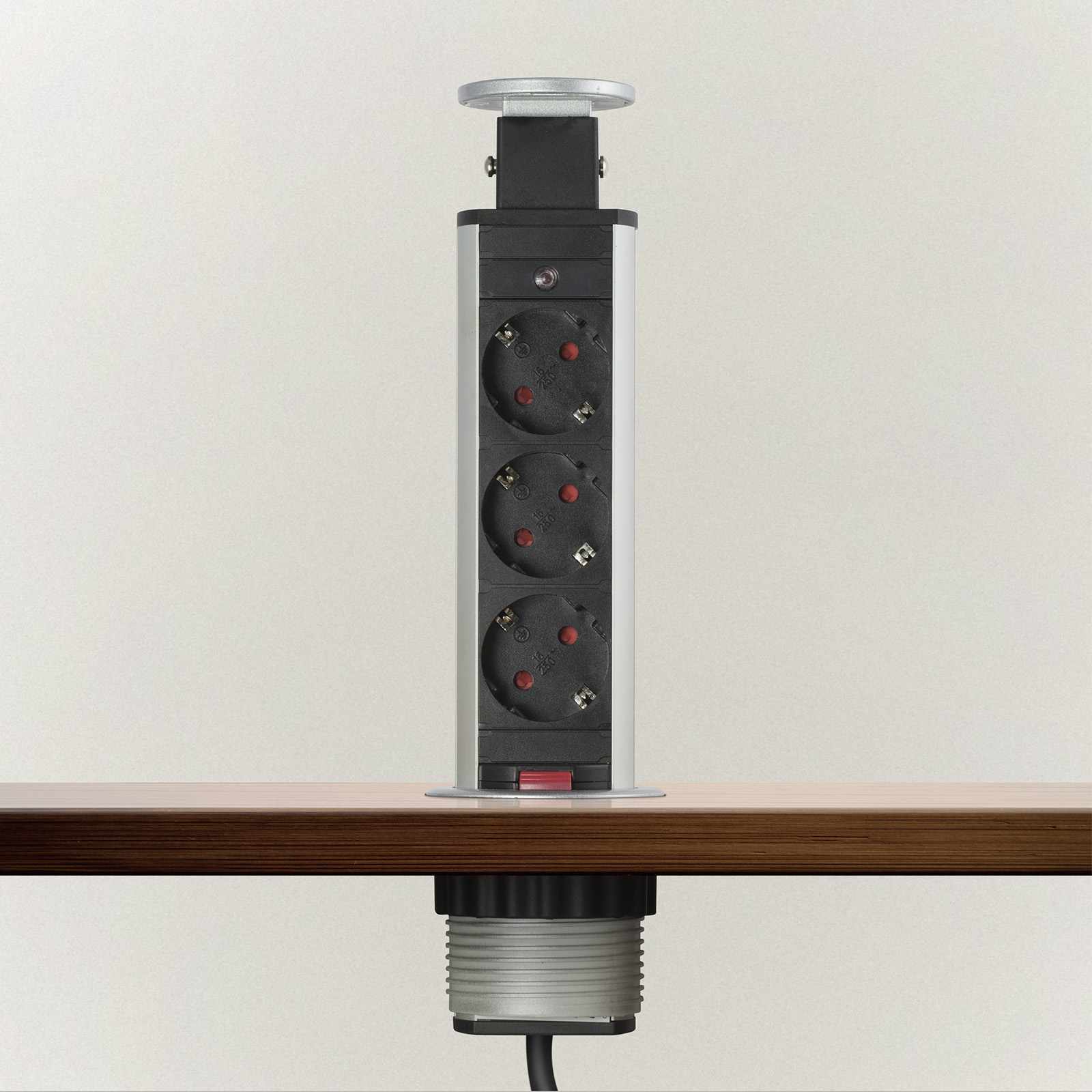 Süllyeszthető elosztó irodai és otthoni felhasználásra, fém házzal, 3 db gyermekvédelemmel ellátott aljzattal. Asztala, bútora legyen mindig elegáns és rendezett, mégis funkcionális. A rejtett elosztó kiváló megoldás lehet ha már például kész konyhával rendelkezik, de nincs elegendő konnektor a kívánt helyen. Ilyenkor falvésés és villamos hálózat bővítés nélkül, remek alternatíva lehet egy rejtett elosztó. Egy mozdulat és máris rendelkezésre áll 3 szabad konnektor. Ideális lehet olyan elektromos eszközökhöz, amit nem folyamatosan használunk, kenyérpirító, vízforraló… Ha használaton kívül vannak, a „töltőoszlop” egy mozdulattal elrejthető, ezzel is megkönnyítve például a takarítást, valamint rendezett, letisztult külsőt ad a helységnek.