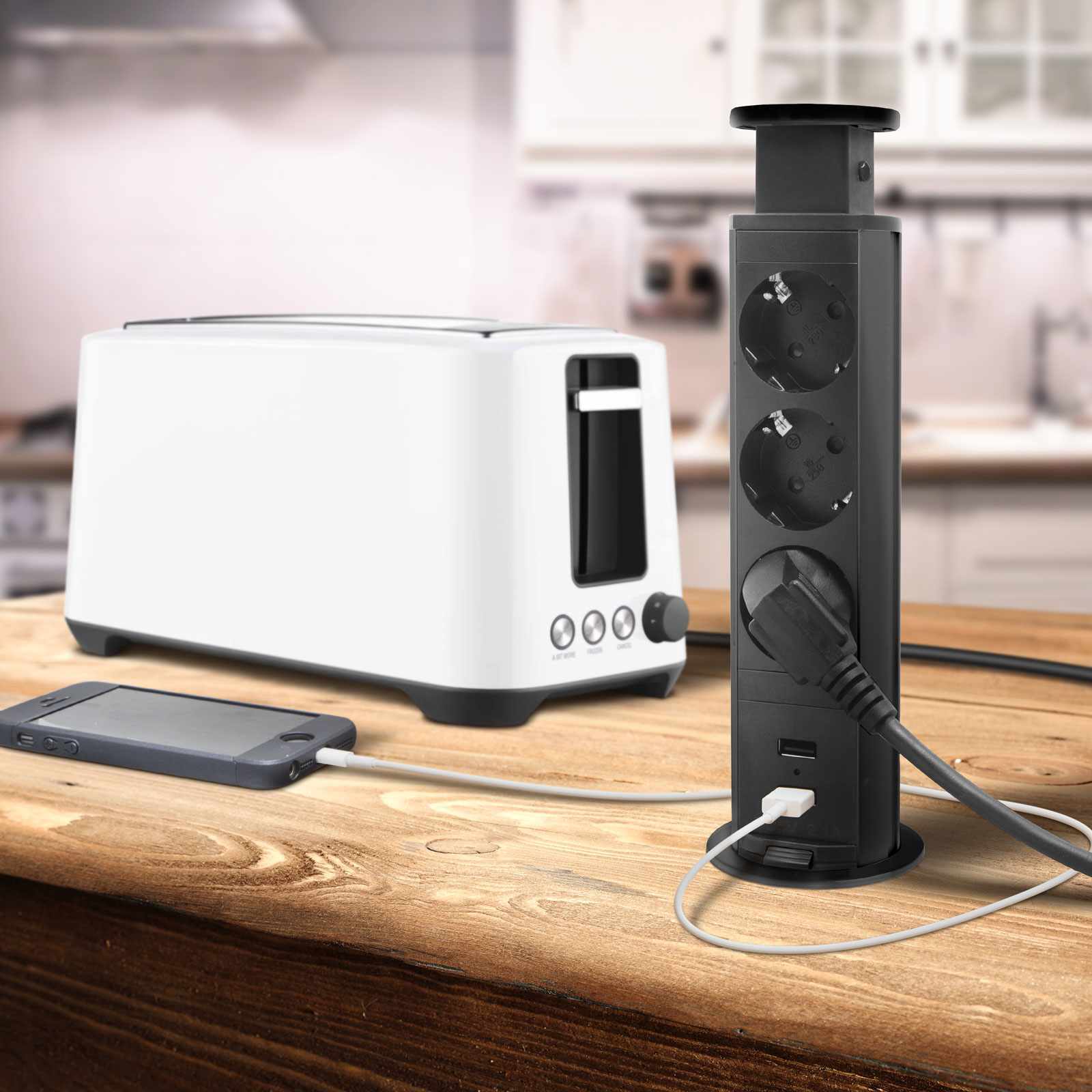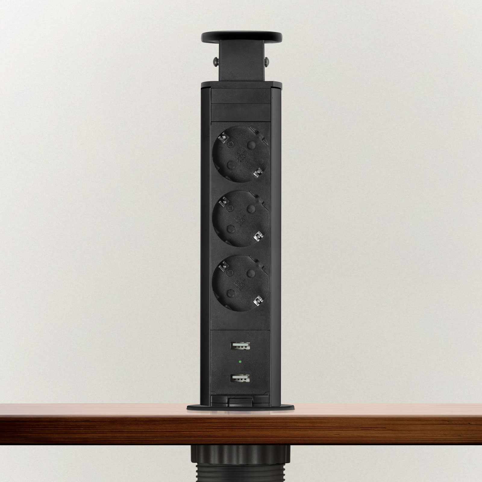 Süllyeszthető elosztó irodai és otthoni felhasználásra, fém házzal, 3 db gyermekvédelemmel ellátott aljzattal és 2 db USB csatlakozóval. Asztala, bútora legyen mindig elegáns és rendezett, mégis funkcionális. Az USB aljaztról könnyen töltheti telefonját, tabletjét vagy egyéb digitális eszközeit. A rejtett elosztó kiváló megoldás lehet ha már például kész konyhával rendelkezik, de nincs elegendő konnektor a kívánt helyen. Ilyenkor falvésés és villamos hálózat bővítés nélkül, remek alternatíva lehet egy rejtett elosztó. Egy mozdulat és máris rendelkezésre áll 3 szabad konnektor. Ideális lehet olyan elektromos eszközökhöz, amit nem folyamatosan használunk, kenyérpirító, vízforraló… Ha használaton kívül vannak, a „töltőoszlop” egy mozdulattal elrejthető, ezzel is megkönnyítve például a takarítást, valamint rendezett, letisztult külsőt ad a helységnek.