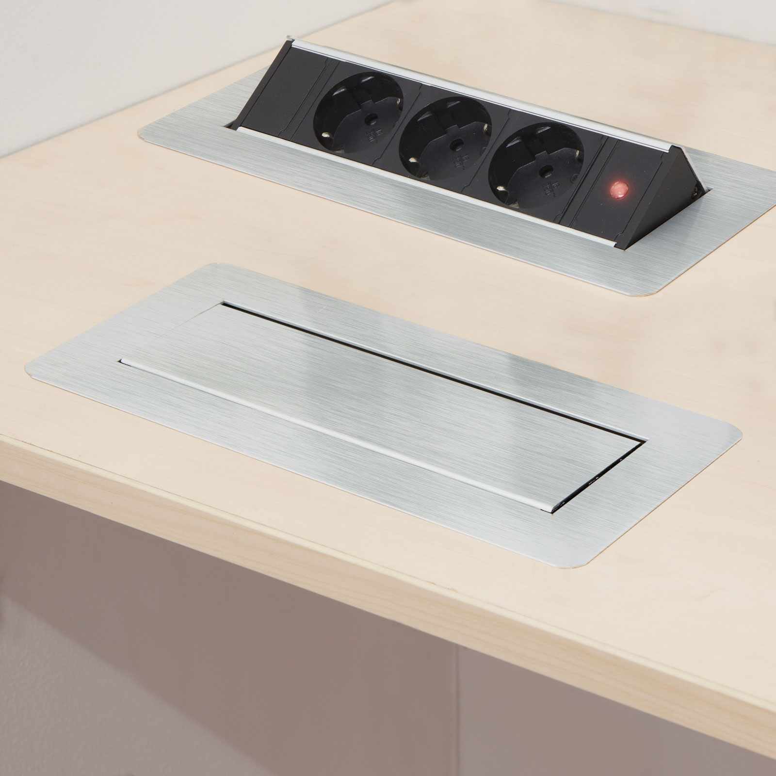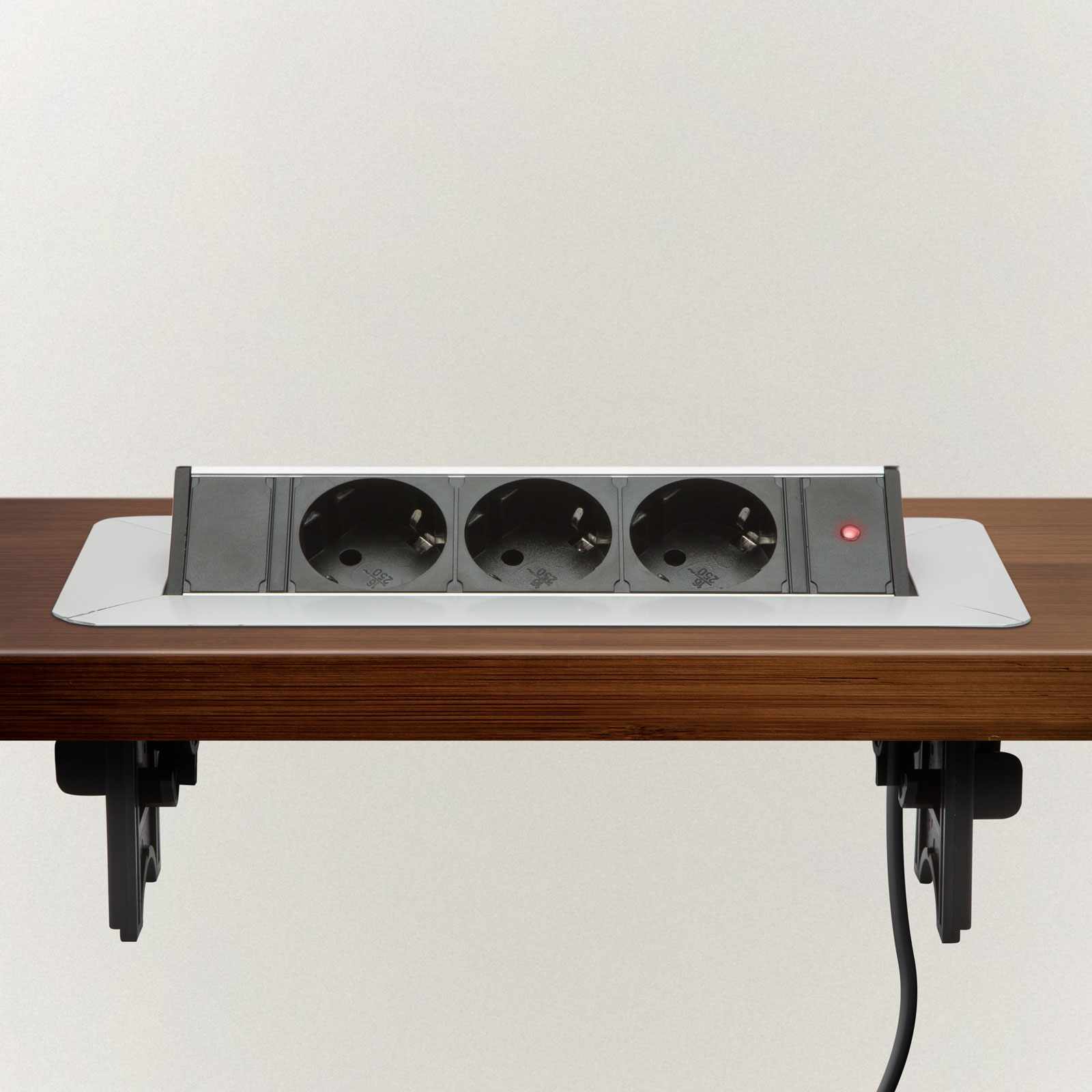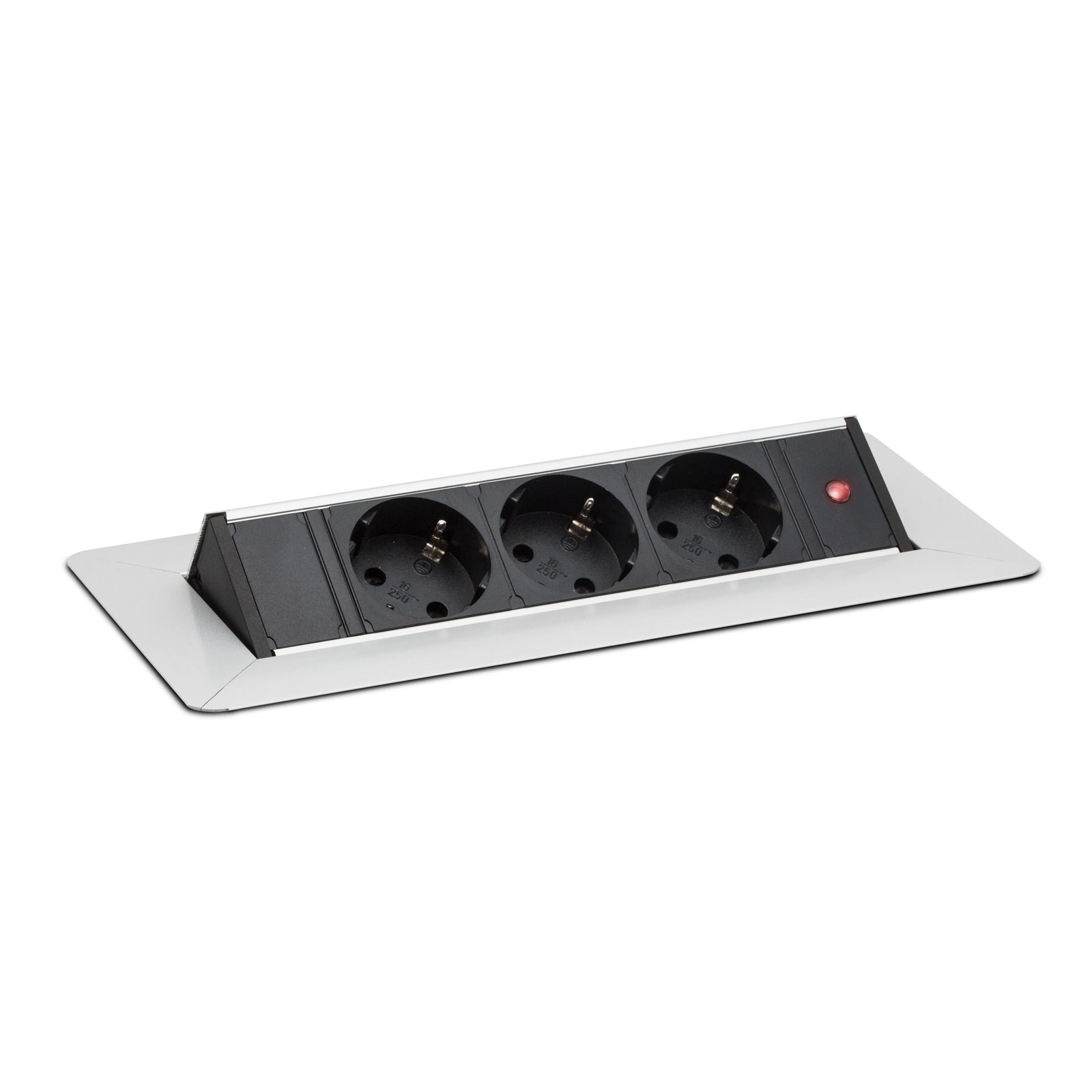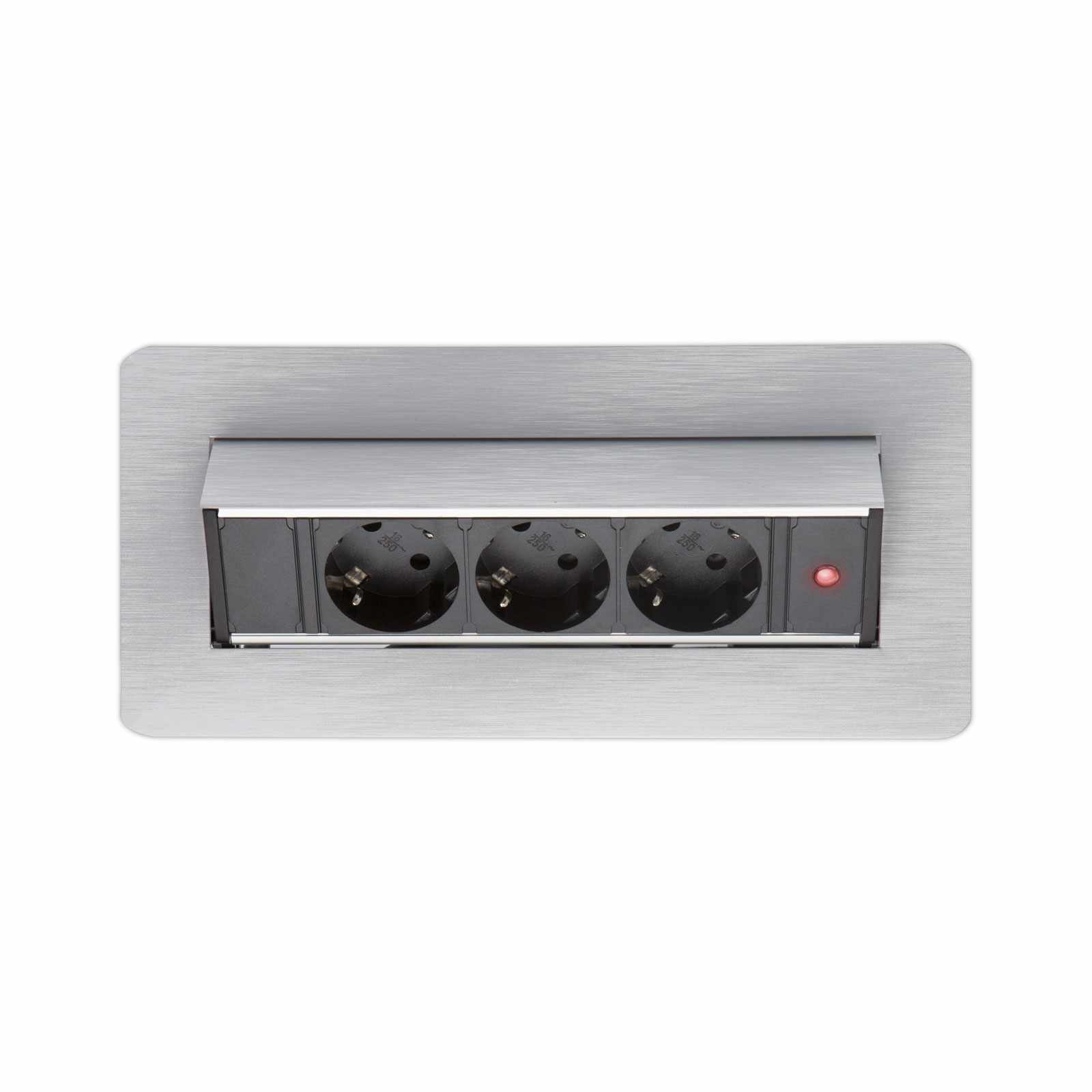 Süllyeszthető elosztó irodai és otthoni felhasználásra, szálcsiszolt felülettel, 3 db gyermekvédelemmel ellátott aljzattal. Asztala, bútora legyen mindig elegáns és rendezett, mégis funkcionális. A rejtett elosztó kiváló megoldás lehet ha már például kész konyhával rendelkezik, de nincs elegendő konnektor a kívánt helyen. Ilyenkor falvésés és villamos hálózat bővítés nélkül, remek alternatíva lehet egy rejtett elosztó. Egy mozdulat és máris rendelkezésre áll 3 szabad konnektor. Ideális lehet olyan elektromos eszközökhöz, amit nem folyamatosan használunk, kenyérpirító, vízforraló… Ha használaton kívül vannak, az „flip-up” elosztó egy mozdulattal elrejthető, ezzel is megkönnyítve például a takarítást, valamint rendezett, letisztult külsőt ad a helységnek.