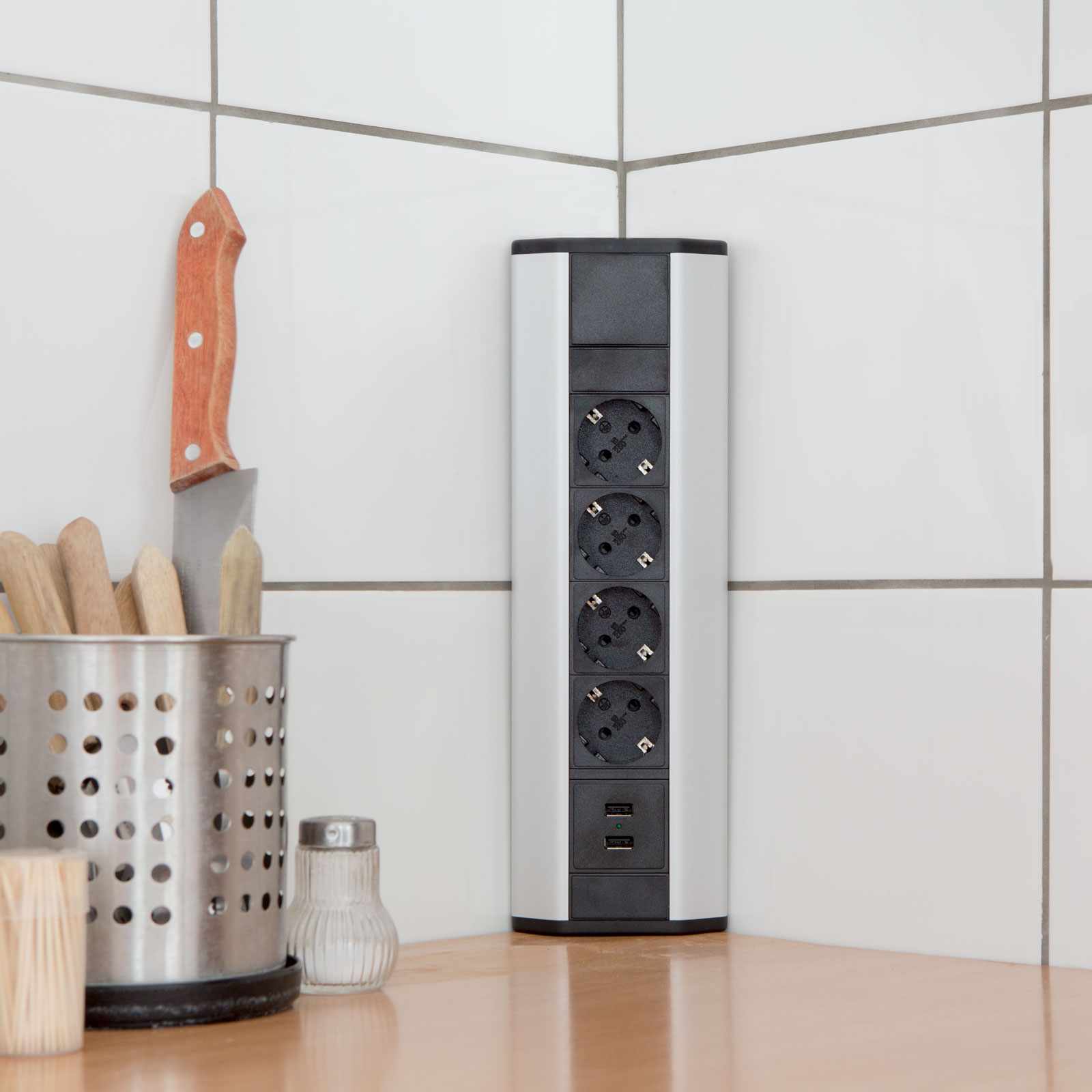 Ennek a sarokban helyezhető elosztónak köszönhetően helyet takaríthat meg bármely felületen. Ideális lehet konyhákba, szobákba, irodákba és minden olyan helyen, ahol nem lehetséges villamoshálózat, konnektor kiépítése. A beépített USB portoknak köszönhetően könnyen és gyorsan feltöltheti mobil eszközeit is. Használatával elkerülhető a falak vésése vagy a munkapult, bútorlap nagymértékű vágása. A sarokba helyezhető elosztó helyet takarít meg Önnek a falfelületen is, így például több hely marad a konyhapult felett kések, konyhai eszközök rögzítésére, felakasztására.