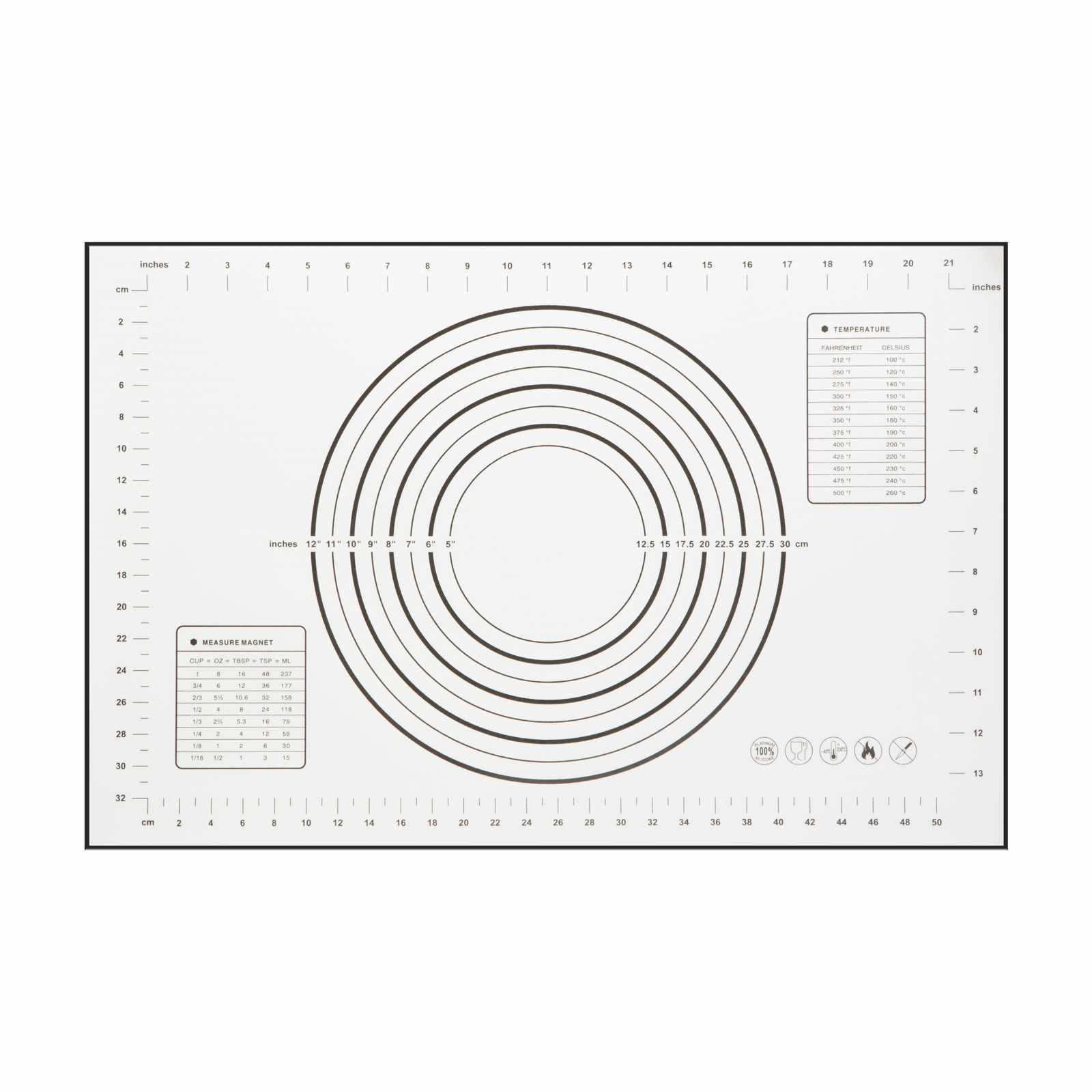 Méretpontos nyújtást segítő skálázott szilikon lap, amely használatával gyorsan készíthet bármilyen tésztából kör, négyzet, téglalap alakú süteményt.