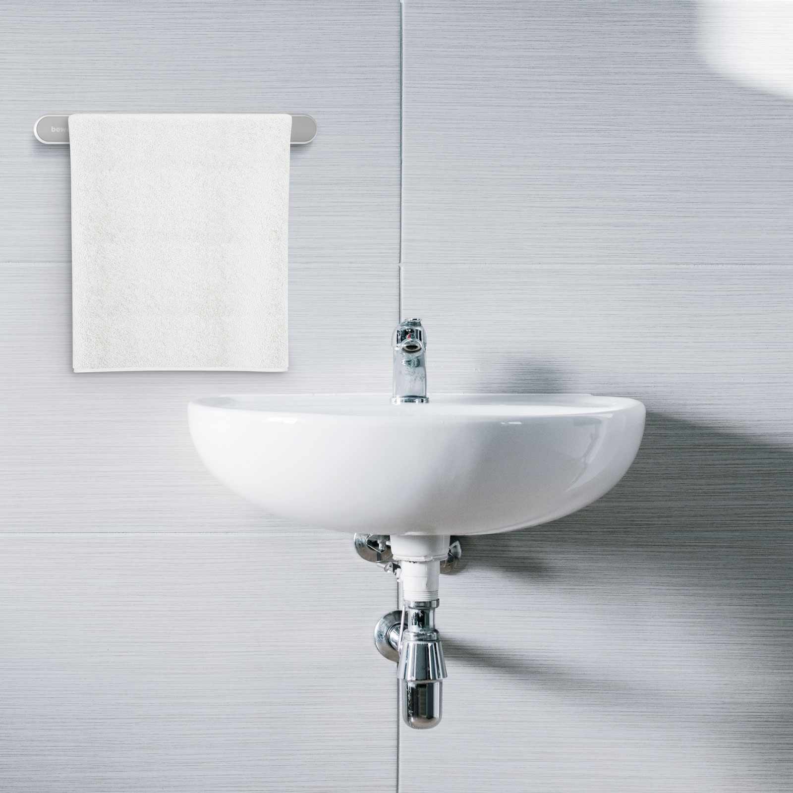 Erős öntapadós felülettel rendelkező törölközőtartó, amely bármilyen csempére, üvegre felragasztható. A letisztult design minden fürdőszoba enteriőrben jól mutat. Ideális lehet törölközőn kívül fürdőszobai papucs, mamusz helytakarékos tárolására is. Egyszerűen telepíthető: Tisztítsa meg és zsírtalanítsa a felületet, ragassza a megfelelő helyre a két korongot, majd felülről lefelé pattintsa rá a tartórudat.