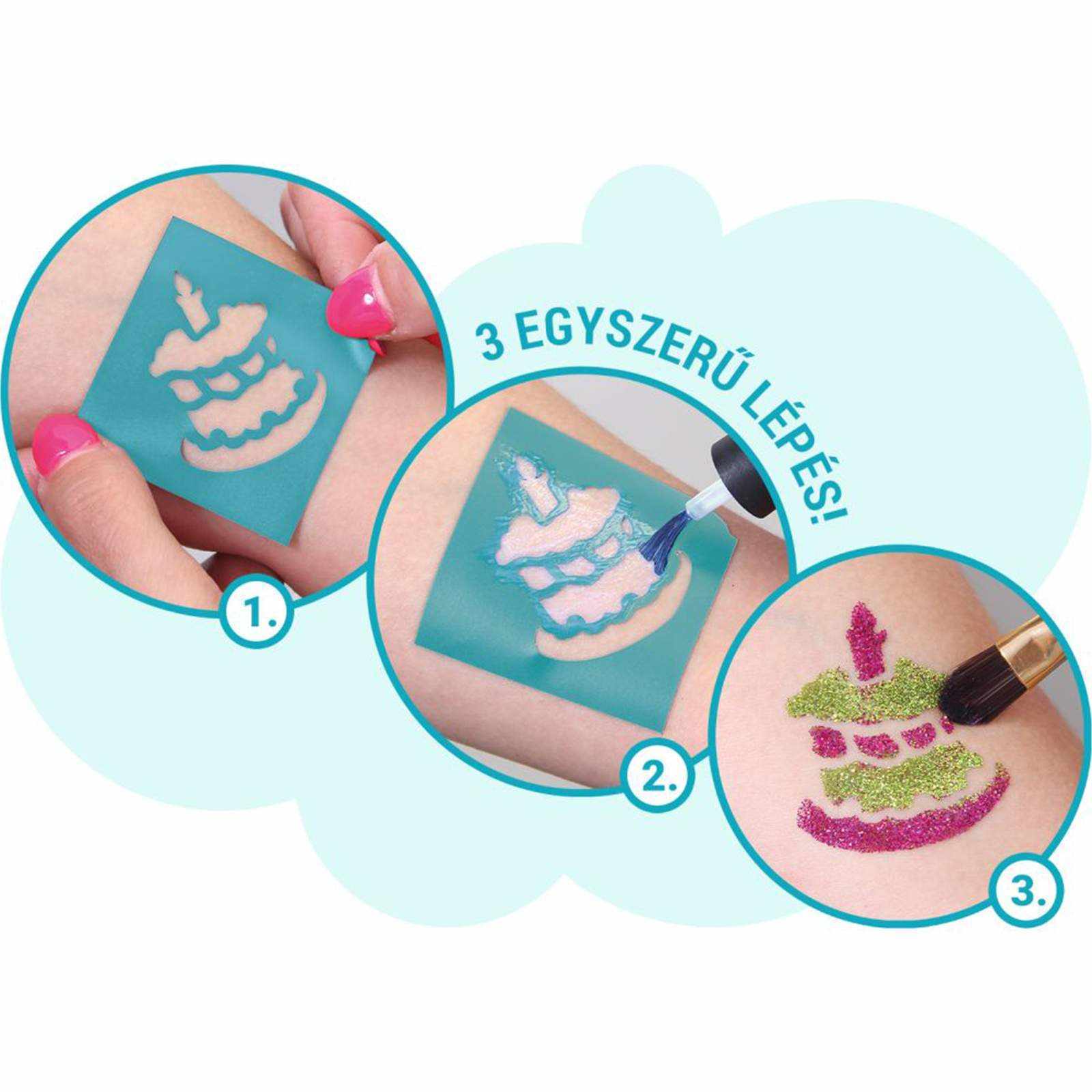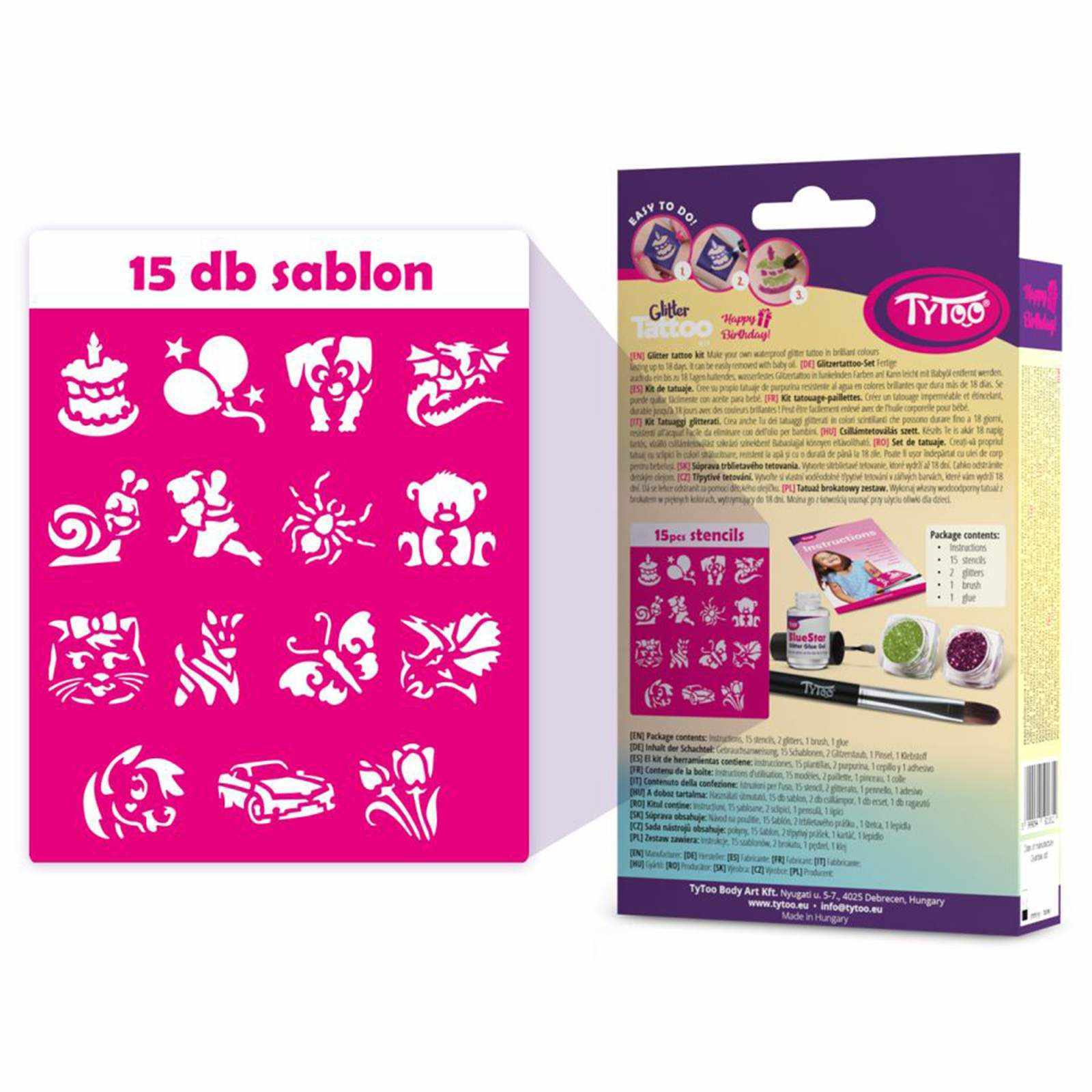 15 db kézzel rajzolt sablon, népszerű fiús és lányos mintákkal vegyesen 2 db kozmetikai csillámpor a gyerekek kedvenc színeiben 1 db BlueStar ragasztó, a legtartósabb típus, amivel akár 18 napig is fent marad a csillámtetkó 1 db puha szőrű kozmetikai ecset Részletes használati útmutató |