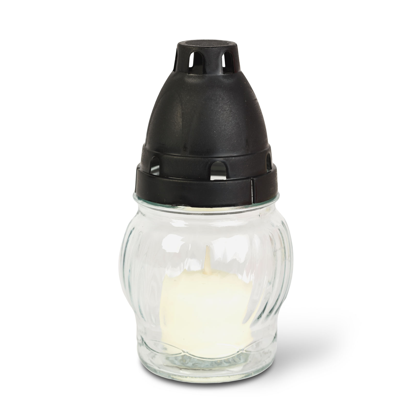 Üveg mécses műanyag kupakkal, üveg szín: fehér, kupak szín: fekete – 14 cm