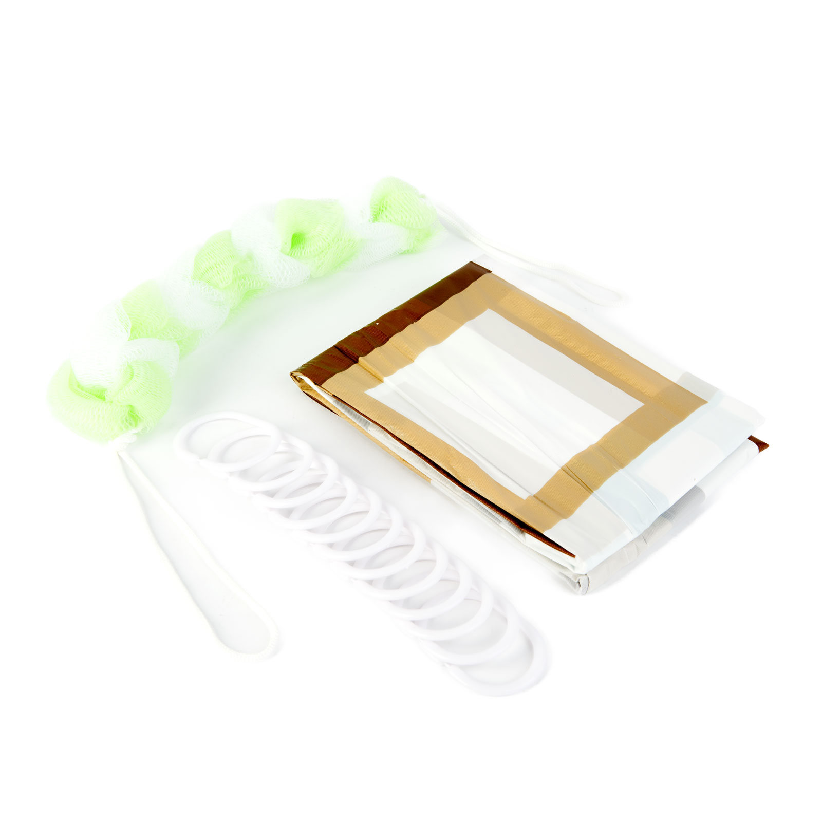 Fürdőszobák nélkülözhetetlen kelléke a zuhanyfüggöny, legyen szó zuhanytálcáról vagy fürdőkádról. Ezzel a zuhanyfüggöny szettel biztosan nem tud melléfogni, minden fürdőszoba hangulatát feldobja. Használata egyszerű, csak akassza be a lyukakba a karikákat és rögzítse a zuhanyfüggöny rúdon. A szett részét képezi egy hosszúkás fürdőpamacs is, mindkét végén madzaggal, amely segítségével gyerekjáték például a hátmosás.